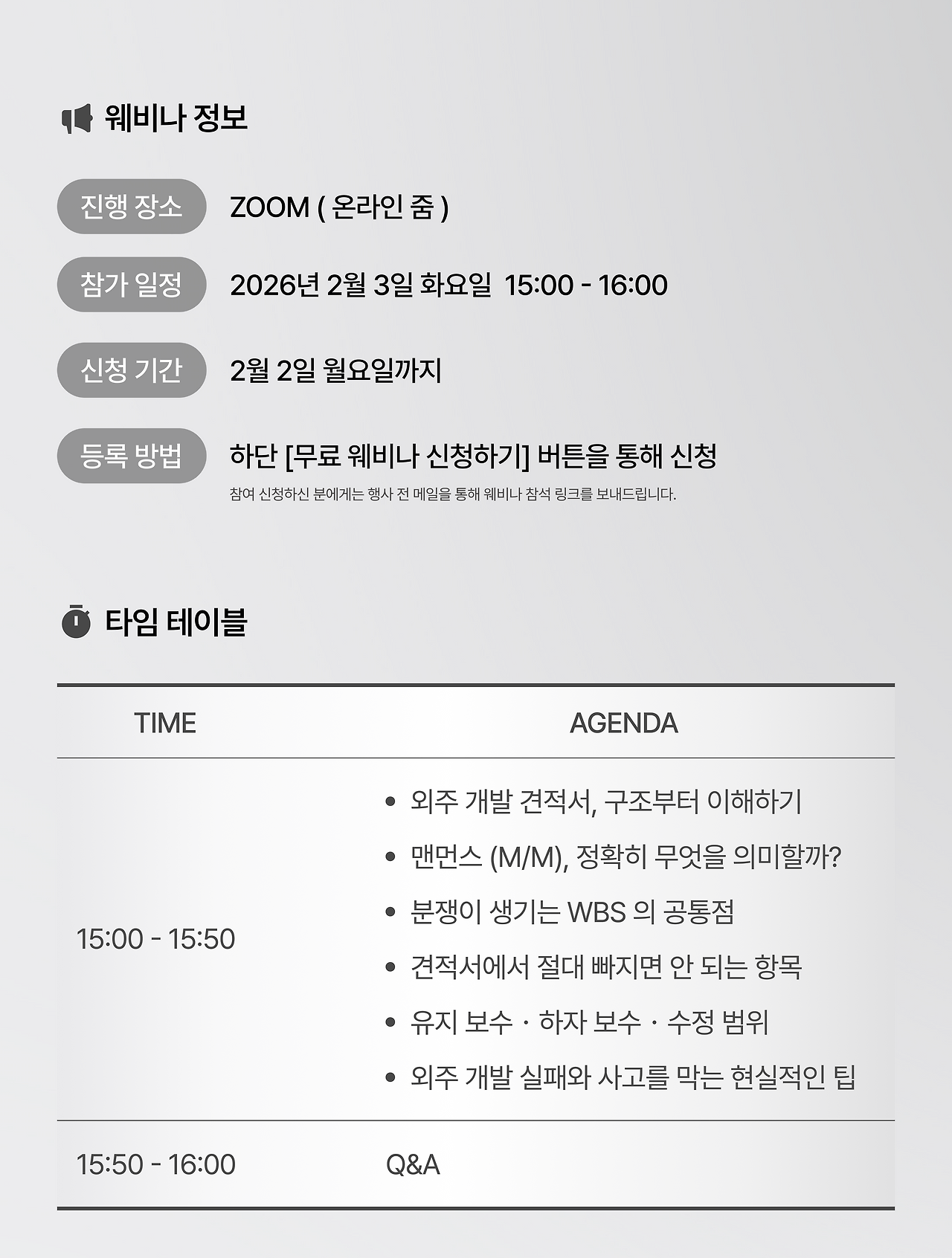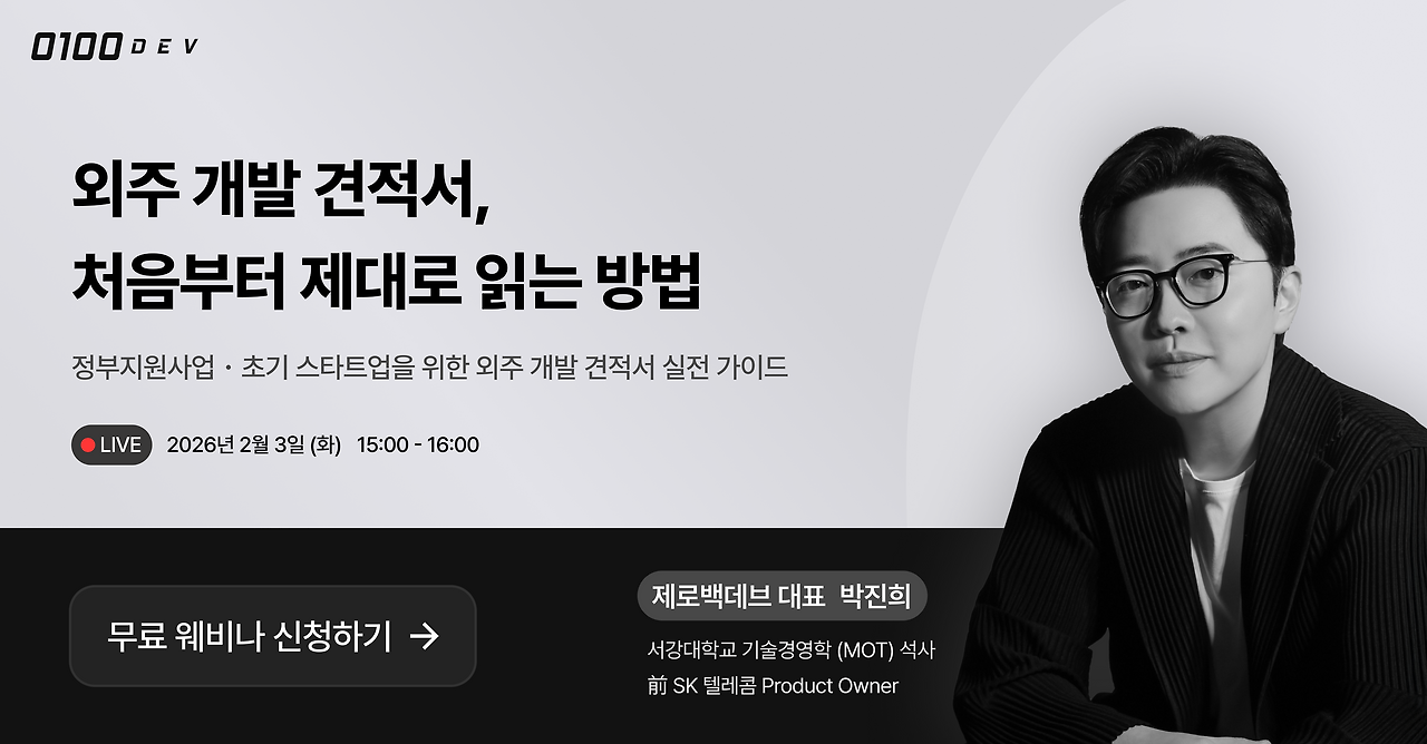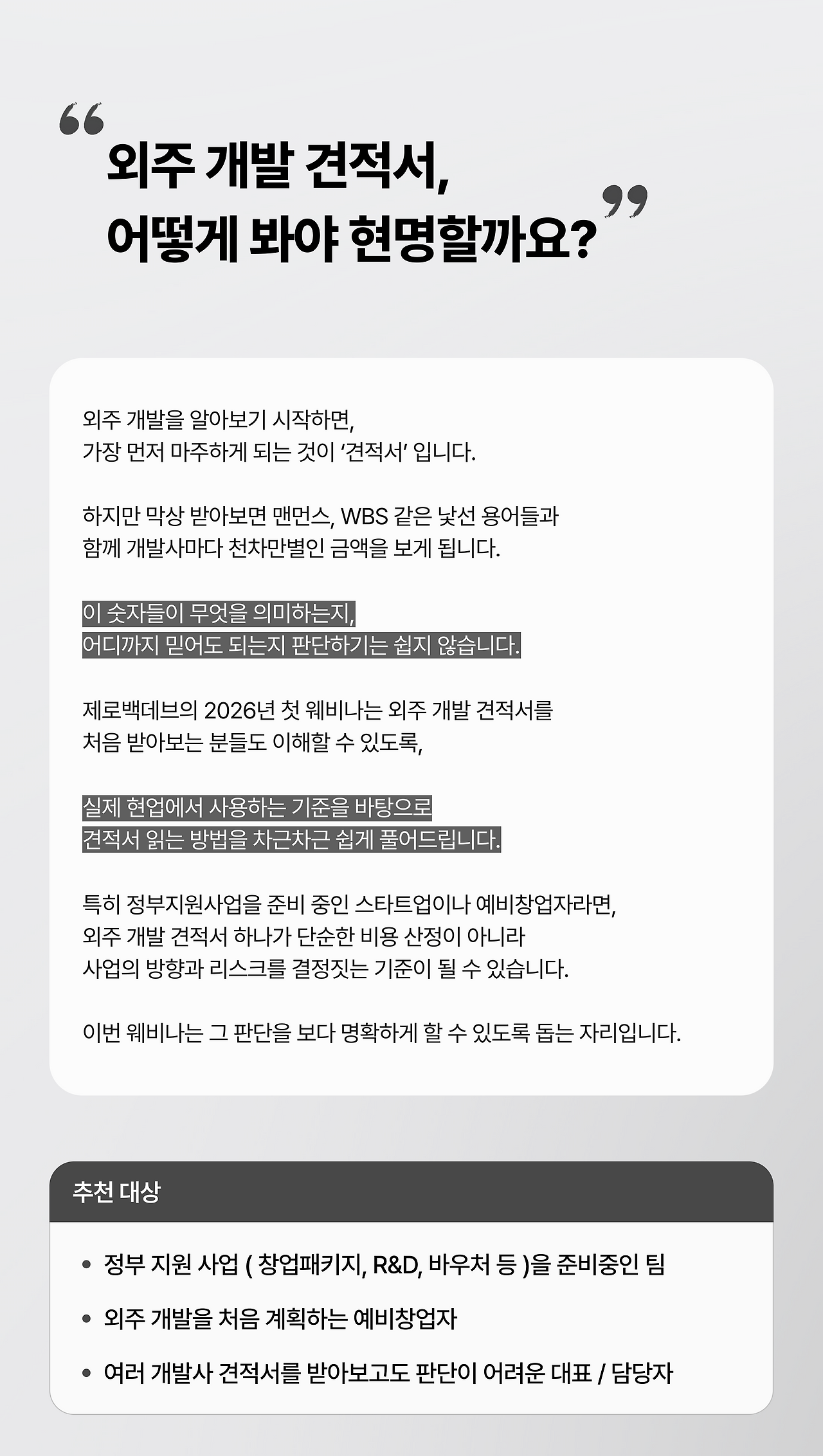 제로백데브의 2026년 첫 웨비나는 외주 개발 견적서를 처음 받아보는 분들도 이해할 수 있도록, 실제 현업에서 사용하는 기준을 바탕으로 견적서 읽는 방법을 차근차근 쉽게 풀어드립니다.