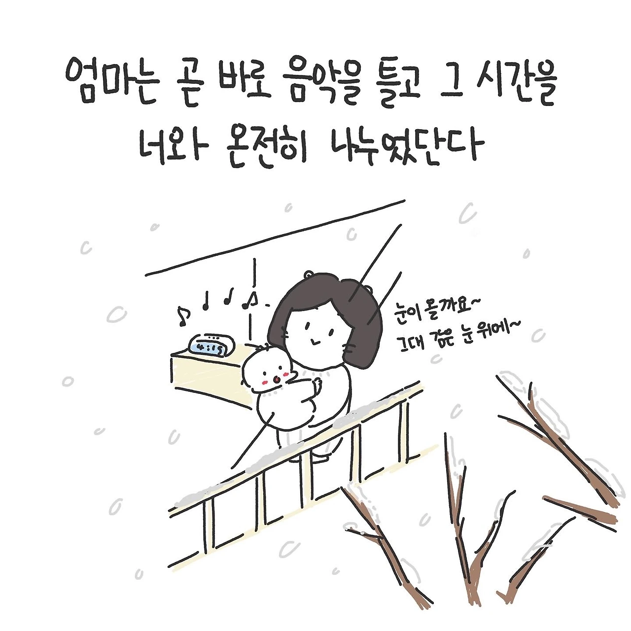 눈 오는 날 아기와 좋아하는 음악을 들으며 함께 시간을 공유할 수 있음에 감사합니다.
