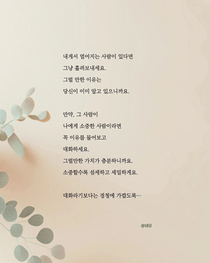 서서히, 조금씩 멀어져 가는 것은 누구의 특별한 잘못 때문이 아니다. 계절이 바뀌듯 관계에도 자연스러운 멀어짐이 늘 있기 마련이다. 그래서 때로는 아무리 애쓰고 붙잡아도 결국 멀어지는 것이 관계의 진리에 더 가까울지도 모른다. 떠나가는 것을 억지로 움켜쥐기보다 바람에 돛을 맡기듯 흘려보내는 용기가 필요한 이유다. 그럴만한 이유는 이미 우리 내면이 알고 있다.