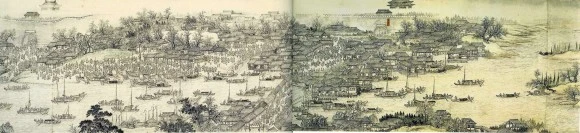 <「강희남순도권>은 당시 청나라의 유명한 화가들인 왕휘, 양진 등 여러 궁정화가들이 합작하여 5~6년이 걸려 12권을 완성했는데, <강희남순도권>은 중국의 화가들도 원근법적 시점으로 충분히 리얼하게 그릴 실력이 있었음을 보여준다.