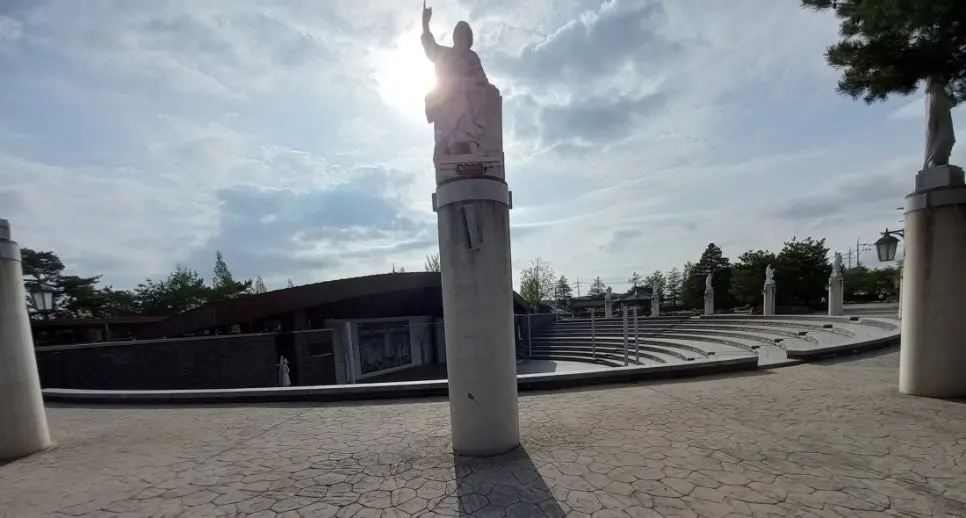 새남터에서의 순교를 상징하는 원형 아레나는 12사도상과 함께 장엄한 모습이었다. 이곳은 김대건 신부님의 탄생과 순교를 함께 기억하는 특별한 공간이다.생가가 탄생이라면 아레나는 죽음이다.