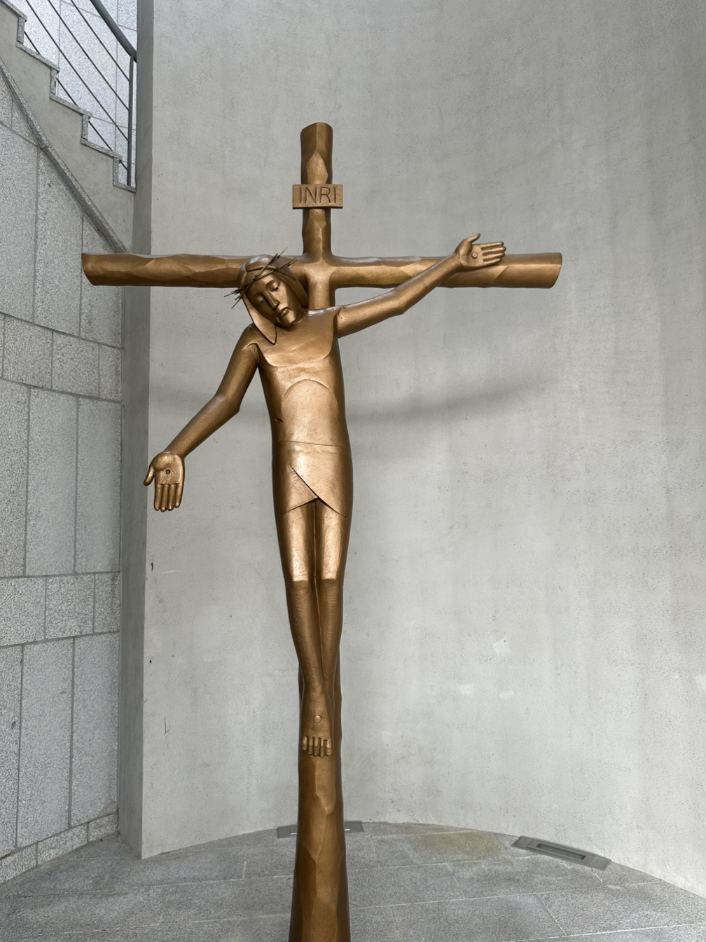 경당 밖으로 나와서 2층으로 올라가는 계단 시작 부분에 처음 보는 ‘오른손을 내린 예수상’이 있다. '멜리데의 십자고상‘이라고 부른다. 스페인 멜리데 지역의 한성당에서 매번 같은 주제로 고해성사를 하는 신자에게 신부가 더 이상 용서할 수 없다고 했다. 이에 예수님이 손을 내려 "피를 흘린 건 네가 아니다"라며 직접 그 신자에게 십자가를 그어 줬다는 이야기가 있다. 같은 죄를 짓더라도 끝없이 용서해 준다는 이 이야기에서 비롯한 자비의 예수상이다. 손을 만지고 기도를 하면 다 들어주실 것 같다.