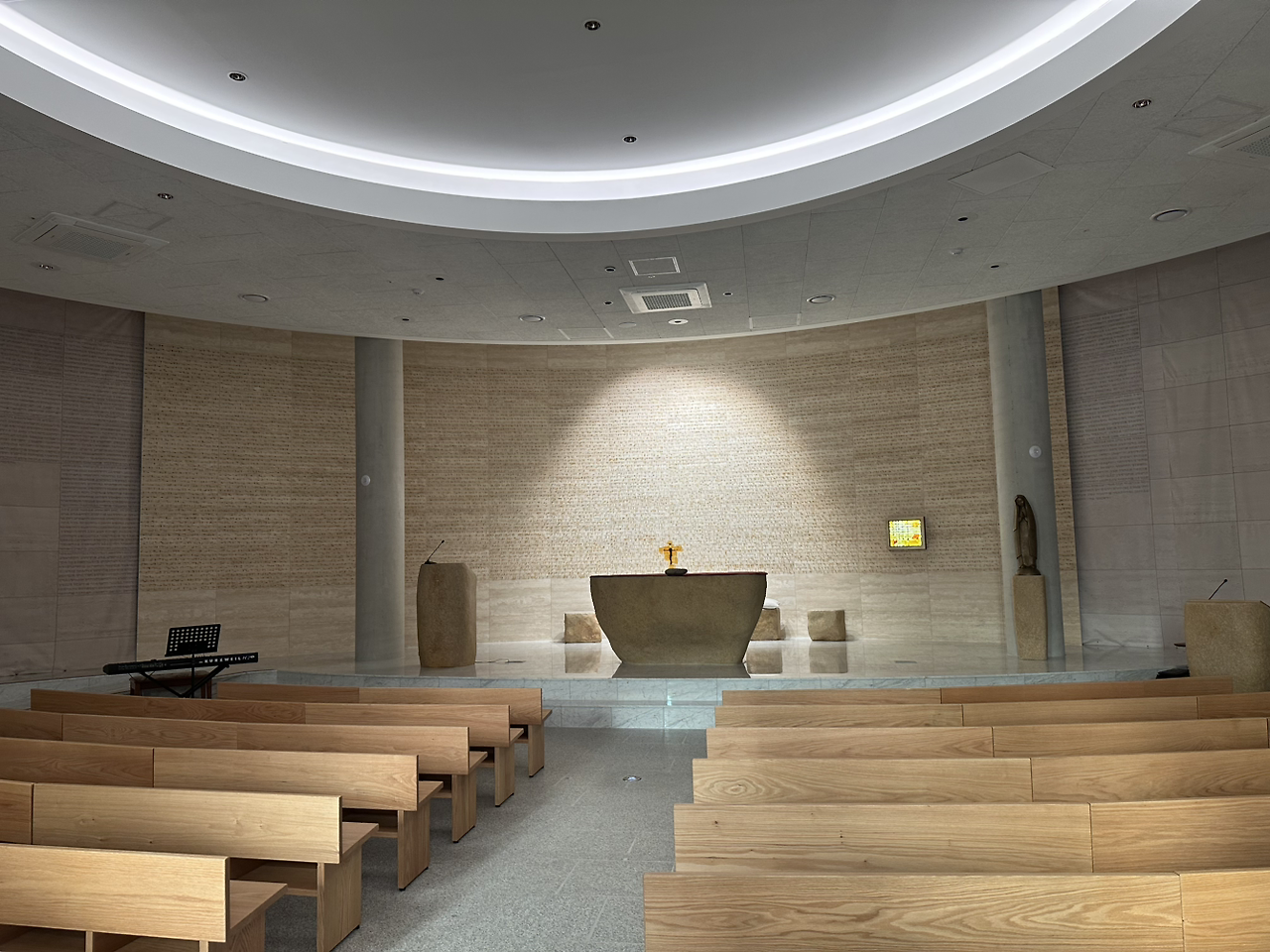 경주석으로 만든 제단, 마태오복음이 새겨진 정면, 조완희 작가의 현대적인 스테인드글라스로 표현된 십자가의 길까지 함께 아름다운 공간을 만들어냈다. 반원형의 경당에 들어가면 누구나가 머물고 싶을 것이다.