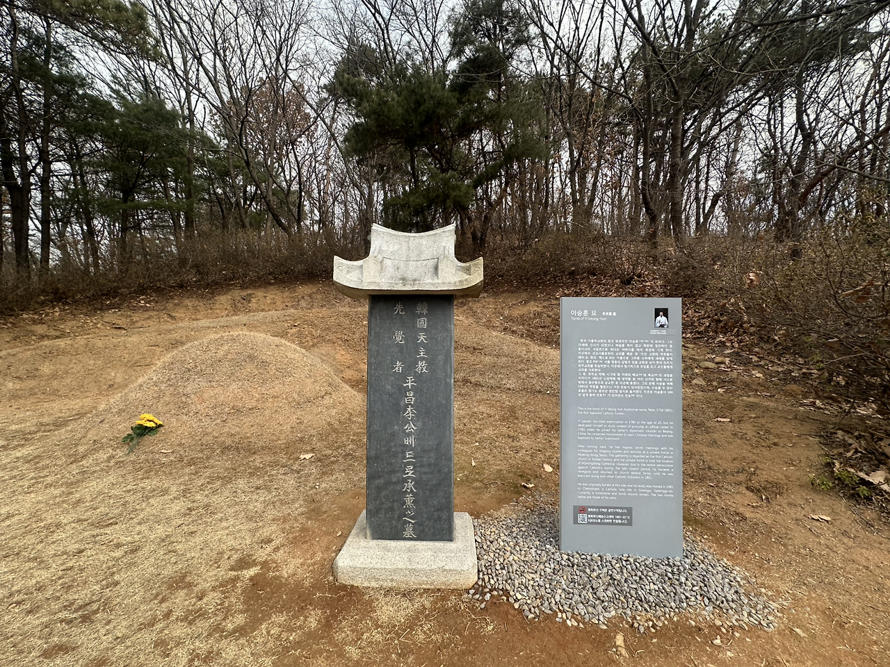 드디어 묘지에 도착. 이승훈의 장남과 삼남의 묘가 먼저 있다. 이승훈 4대손까지 순교자가 8명에 이른다. 이승훈은 집안의 압력으로 배교를 했지만 1801년 신유박해 때 체포되어 참수되었다. 조선시대 천주교의 시작점에 해당하기에 박해 때마다 이름이 거론되었다. 중국까지 건너가 한국의 최초 세례자로 십자고상이나 서적들을 가지고 와 천주교를 전파했던 이승훈 베드로. 덕분에 우리나라에 교회 공동체가 만들어졌다. 그럼에도 복자나 성인품에 오르지 못한 것은 몇 차례에 걸친 배교 때문이었다.