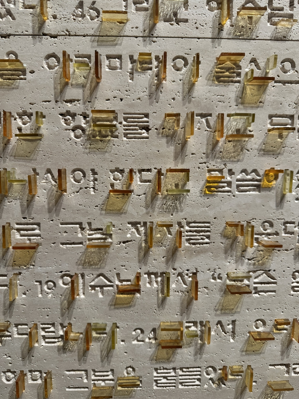 제단 위까지 저세 하게 안내를 해줬다 제대 정면엔 마태오복음이 새겨져 있다 그 옆으로 기도의 벽과 추모의 벽에는 봉헌자들의 이름이 새겨져 있다. 스테인드글라스와 작은 글자로 된 작품은 물론 경당 안 모든 것들에 정성이 보였다.
