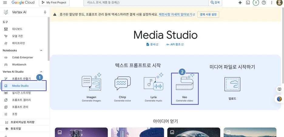 Vertex AI를 활성화한 다음 Media Studio에서 Veo를 선택하면 된다.