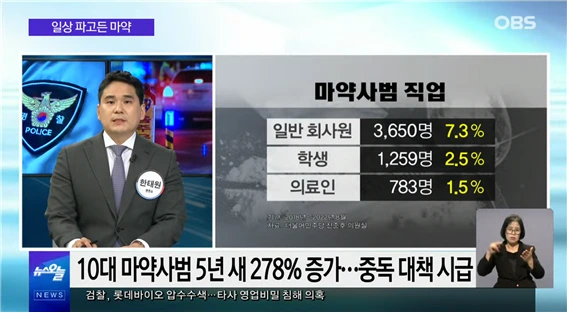 또한 마약사범들의 직업실태를 살펴보면, 전체 마약사범 중 일반 회사원이 7.3%, 학생이 2.5%, 의료인이 1.5%라고 되어 있다. 이제 평범한 직장인이나 학생들도 마약범죄에 쉽게 노출되고 있는 점을 알 수 있다.