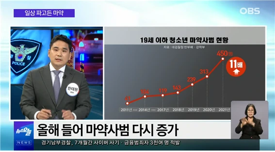 무엇보다도, 19세 이하 청소년 마약사범 문제가 가장 심각하다. 현황 그래프에 의하면, 청소년 마약사범이 2011년 41명에서, 2021년 450명으로 증가하여, 지난 10년 사이에 11배 이상 급증한 것으로 나타났다. 이제 마약범죄는 우리의 일상을 파고드는 것은 물론이고, 청소년들에게도 널리 퍼지고 있는 실정이다.