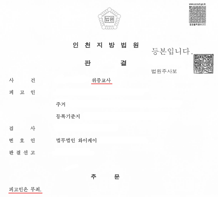 얼마 전 필자가 수행한 사건에서는 위증교사 혐의로 재판에 넘겨진 의뢰인을 변호하여 무죄를 이끌어 낸 사건이 있었다. 수사기관은 의뢰인이 제3자에게 허위 증언을 부탁하며 그 대가로 일정한 이득을 취했다고 보아 위증교사로 기소하였다. 필자는 공판절차에서 제3자 및 관련자들을 증인으로 소환하여 증인신문 절차를 진행하여, 위증교사 사실이 합리적 의심 없이 증명되었다고 보기 어렵다는 점을 강조하였다. 그 결과 재판부는 변론내용을 받아들여 형사소송법 제325조 후단에 따라 의뢰인에게 무죄를 선고하였다.