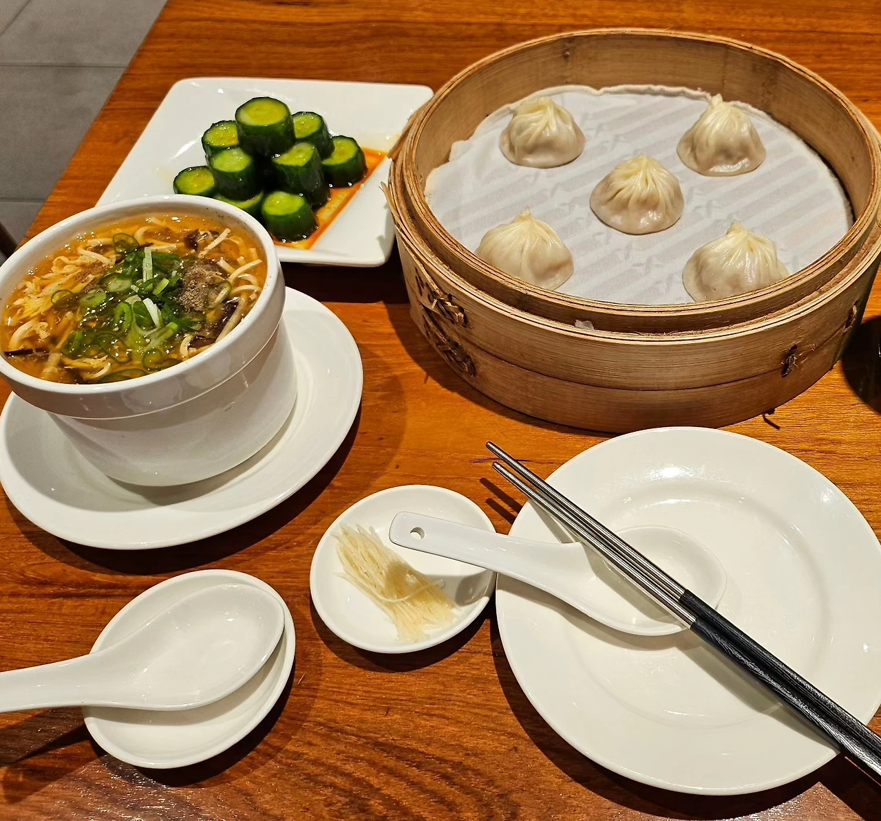 오랜 기다림 끝에 딘타이펑으로 들어갔다. 하루종일 돌아다니느라 배가 고파 샤오롱바오랑 샤오마이 등 이것저것 다 시켜 보았다. 매콤한 오이김치 및 산라탕과 함께 먹으니 딤섬과 샤오롱바오가 끝없이 뱃속으로 들어갔다. 그중에서도 송로버섯 샤오롱바오가 압도적으로 맛있었다. 딤섬 중에서 제일 맛있는 것은 물론, 지금까지 먹어본 트러플 요리 중에서도 가장 맛있었다. 트러플이 세계 3대 진미라는 것을 인정하게 되는 맛이었다