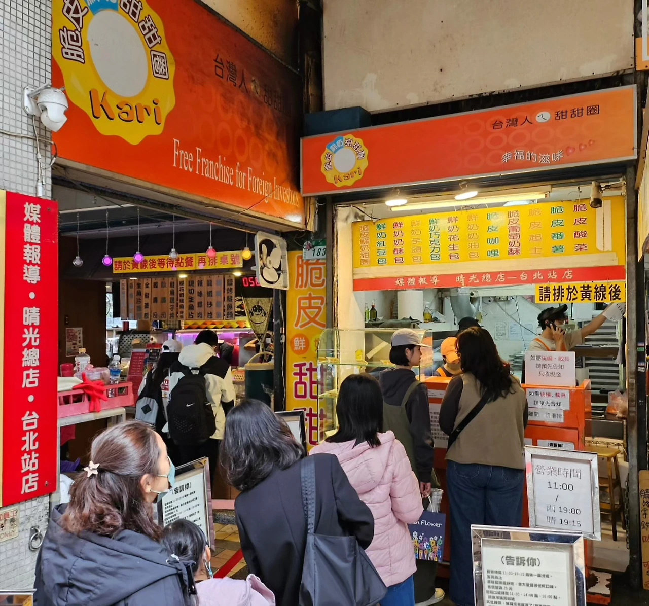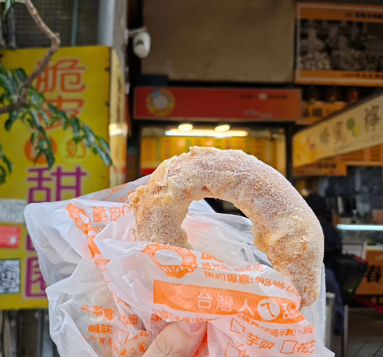공항으로 이동하기 전에 타이베이 메인역 근처에 위치한 대만 카리도넛을 먹었다. 가게 주변에 긴 대기줄이 있어 쉽게 찾을 수 있었다. 대기줄을 보니깐 줄을 서서 도넛을 먹을만한지무척 기대가 되었다. 오리지널 우유도넛만 팔고 있었는데, 그때그때 바로 만들어서 그런지 아주 따끈따끈했다.먹어보니 일반적인 도넛보다 덜 기름지며 담백했고, 도넛에 발라져 있는 고소한 우유설탕과도 조화를 이루었다. 전반적으로 익숙하면서도 먹어본 적 없는 특별한 맛이었고, 25위안(1,000원)의 부담 없는 가격도 인기요인으로 보였다.