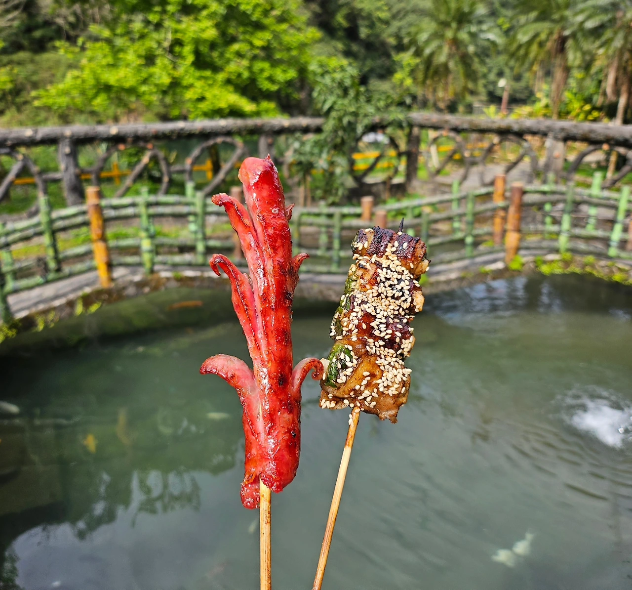 세 번째 장소인 스펀 폭포로 이동했다. 다리를 건너 10분 정도 걸어가자 스펀 폭포가 나타났다.폭포 물줄기와 시원한 물소리가 주변 풍경과 잘 어우러졌다. 자연 속 폭포를 바라보며 폭포소리를 들으니, 잠깐이나마 잡념이 사라지는 느낌이었다. 여행가이드가 상점에 있는 소시지를 특별히 추천했다. 주변 산돼지를 잡아 소시지를 만들어 맛이 다르다고 호언장담했다. 그 진위여부를 확인할 수는 없지만, 지금까지 먹어본 소시지와는 그 비주얼이 전혀 달랐다. 소시지에서 육즙 가득한 고기와 같이 깊고 풍부한 맛이 났다.