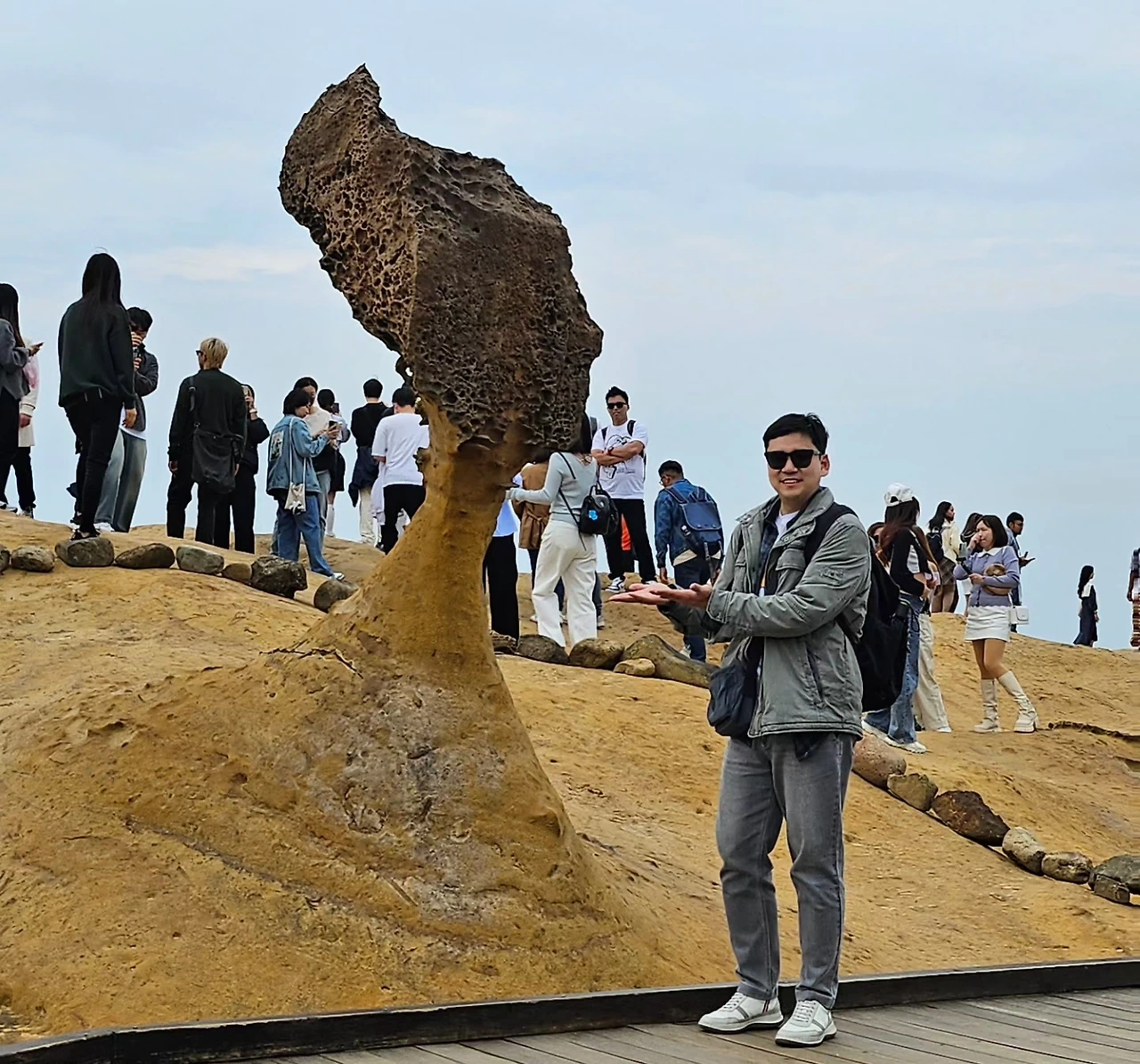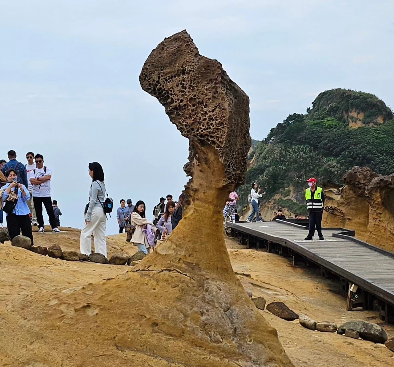 예류 지질공원의 지형은지금도 바람과 파도의 영향으로 계속 바뀌고 있다고 한다. 여왕머리 바위도 차별침식으로 몸통 부분이 빠르게 깎여나가고 있는데, 얼마 지나면 머리 부분이 끊어져 떨어질 것이라고 한다. 다른 구경을 포기하더라도 여왕 머리바위에서의 단독사진은 꼭 남기고 싶어 대기줄을 섰다. 30~40분 정도의 오랜 기다림 끝에 여왕 머리바위를 배경으로 단독샷을 남길 수 있었다.