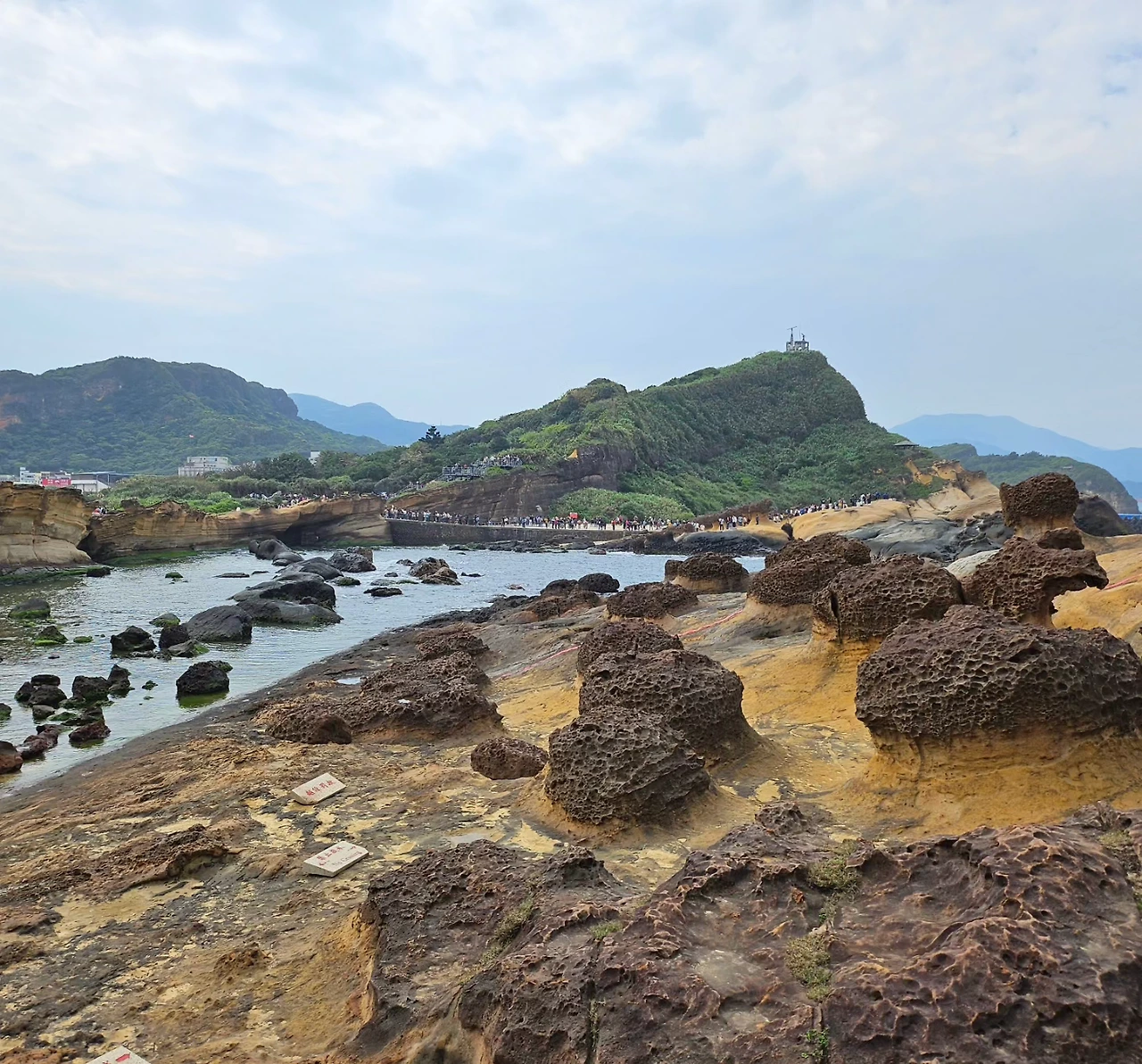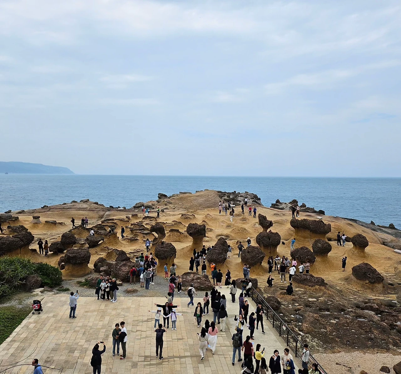 버스가 출발한 지 약 1시간이 지나자 '예류 지질공원'에 도착했다. 주차장에는 관광버스와 차량들로 가득했다. 수백, 수천 명의 관광객들이 비슷한 경로로 이동하는 느낌이었다. 대만은 환태평양 지진대에 위치하여 지진도 많고 특이한 지형도 많은데, 그중에서도 가장 특별한 곳이 바로 예류 지질공원이라고 한다. 수천만 년 전 바다 밑에서 형성된 지각이 융기되어 해수면 위로 드러나고, 비바람과 파도로부터 차별침식을 받아 현재의 독특하고도 경이로운 모습을 갖추었다고 한다.
