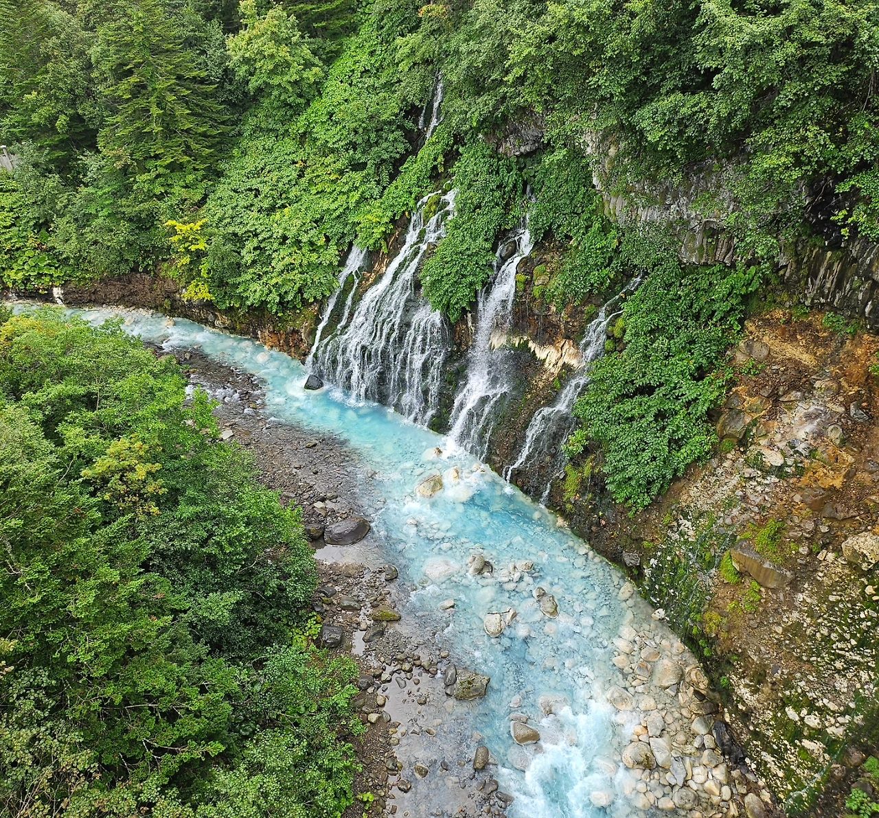 근처 흰수염 폭포로이동했다. 물이 흘러내리는 모습이 흰수염과 같다고 하여 붙여진 이름이라고 한다. 폭포의 물줄기는 에메랄드 빛 실개천으로 흘러내렸는데, 좁은 물줄기가 녹색 숲과 어우러져 환상적인 풍경을 자아내고 있었다.