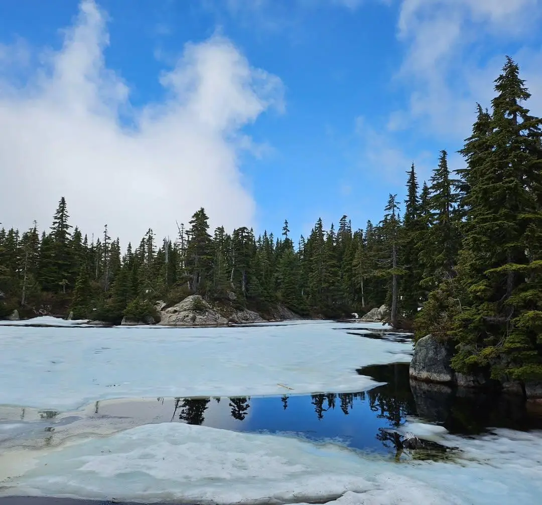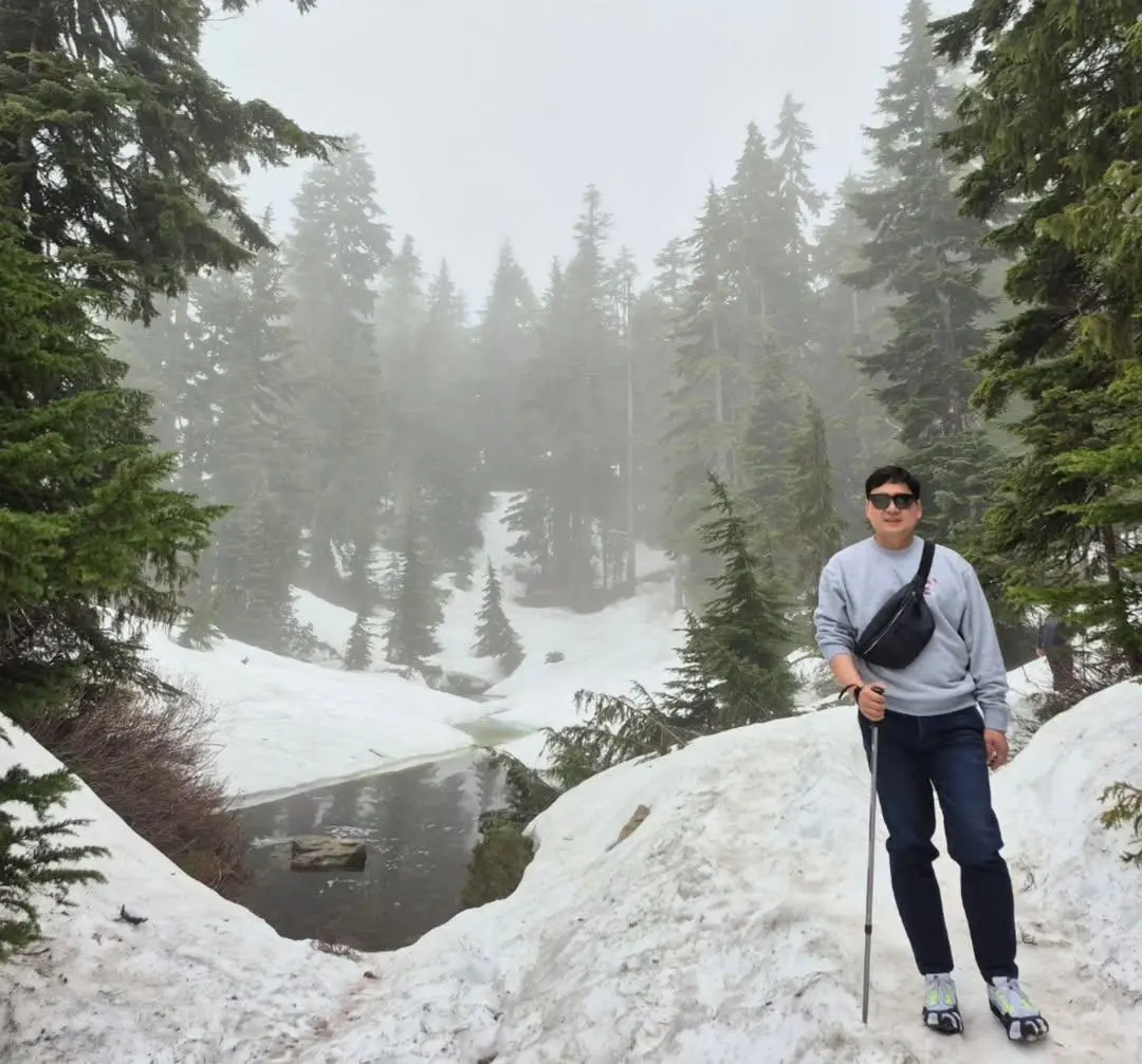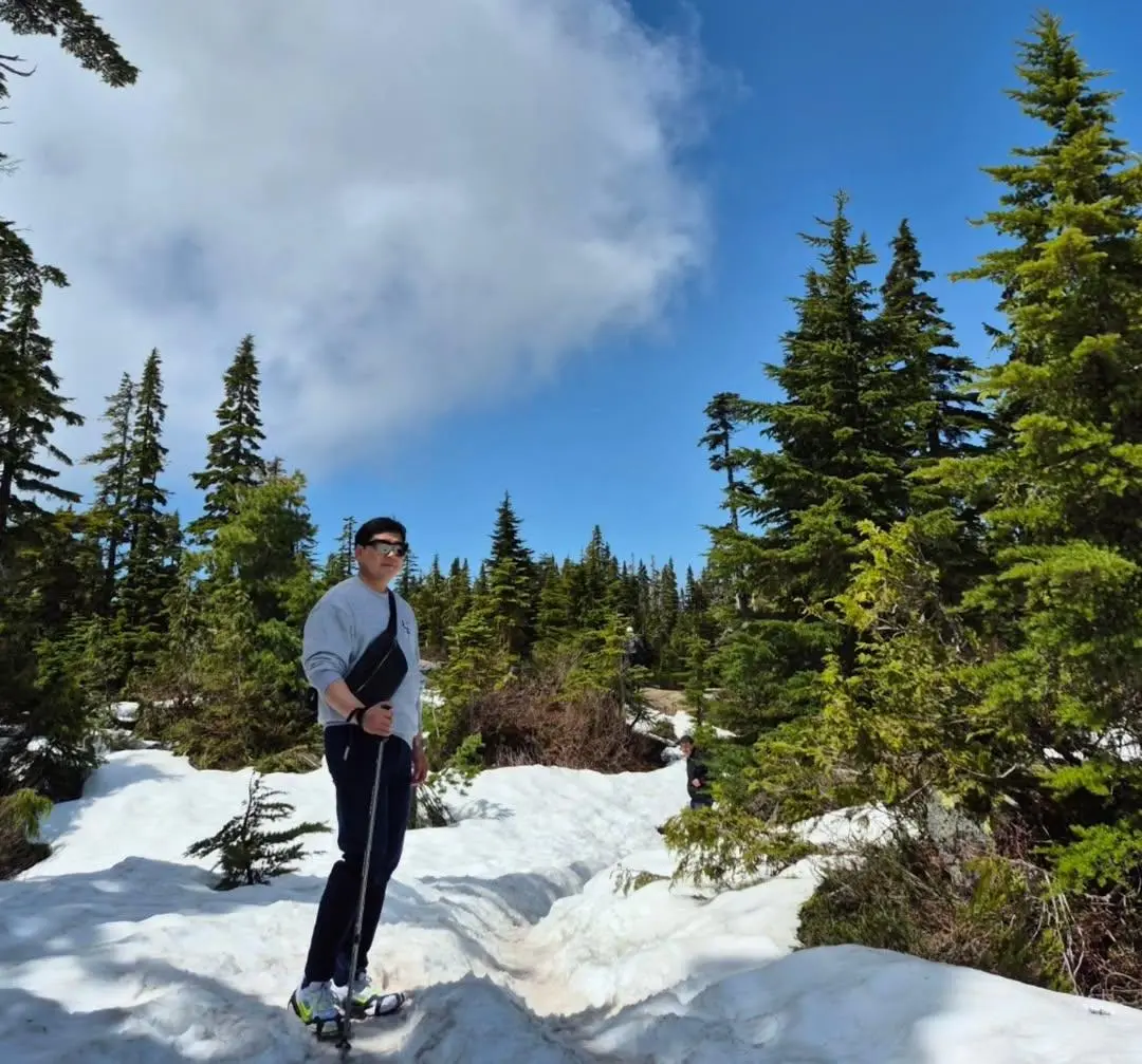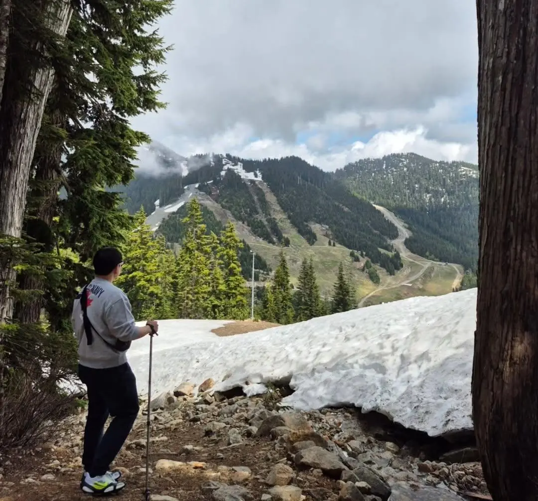 첫날부터 2일 차 오전까지 고민한 끝에 사이프러스 주립공원(Cypress Provincial Park)이 선택되었다. 결론부터 말하자면, 최고의 선택이었다. 아침 일찍 차를 몰아 스키장 근처까지 올라가니 어느새 공기가 달라졌다. 등산로 초입부터 본격적인 산행을 시작했고, 고도가 높아질수록 눈으로 덮인 숲과 능선이 나타났다. 6월 초 한여름에 설경을 보고 눈을 밟는다는 것이 감동적일 수밖에 없었다. 산 아래로 내려다본 밴쿠버 시내의 전경은 마치 한 폭의 그림 같았다.