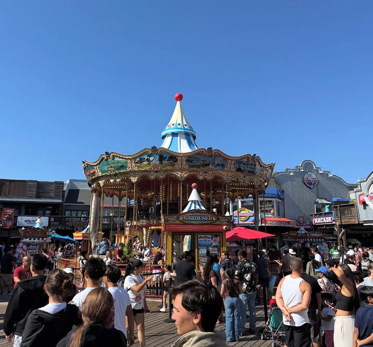 식사를 마친 후, 피셔맨스 워프(Fisherman's Wharf)를 걸어 구경했다. ‘어부의 선착장’이라는 뜻으로, 과거 고기잡이 장소로 사용되던 곳이라고 한다. 그중에서도 가장 유명한 명소는 39번 부두(Pier 39)였다. 피어 39에서 다양한 테마 상점과 레스토랑을 둘러보고, 무심하게 일광욕을 즐기고 있는 바다사자들도 구경했다.