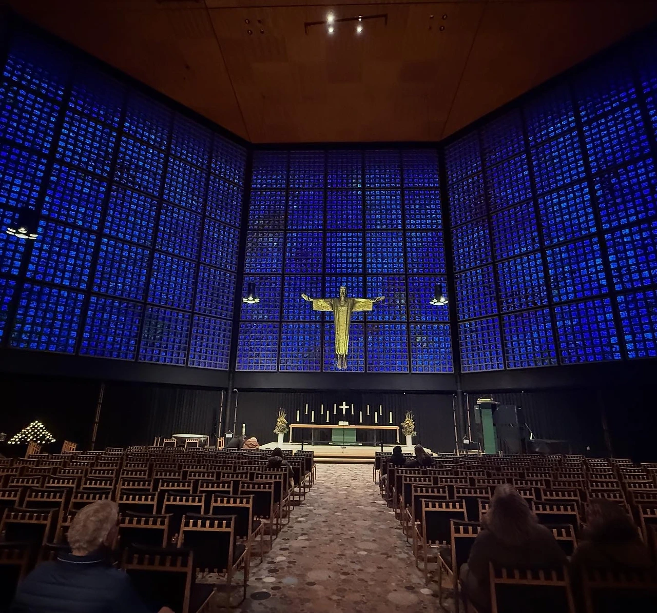 버스를 타고 카이저 빌헬름 기념 교회(Kaiser-Wilhelm-Gedächtnis-Kirche)를 찾았다. 이 교회는 독일을 통일하고 초대 황제가 된 카이저 빌헬름 1세를 기념해 세워진 화려한 건축물이었으나, 제2차 세계대전 중 폭격을 받아 첨탑 일부만 남게 되었다. 전쟁의 참상을 기억하기 위해 파손된 상태 그대로 보존하고 있었고, 이는 평화를 향한 독일의 의지를 상징하는 듯했다. 옆에 새로 지어진 교회는 외관이 계란판을 연상시키는 독특한 구조로 되어 있으며, 내부는 짙은 파란빛 조명으로 현대적이고 신비로운 분위기를 자아냈다.