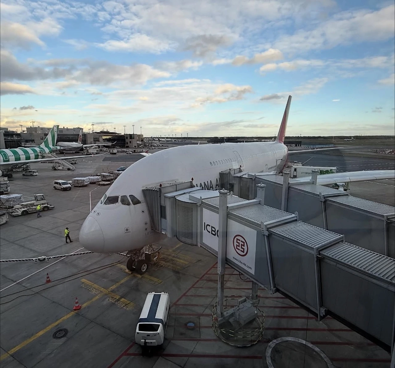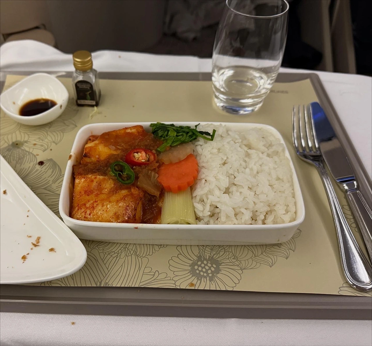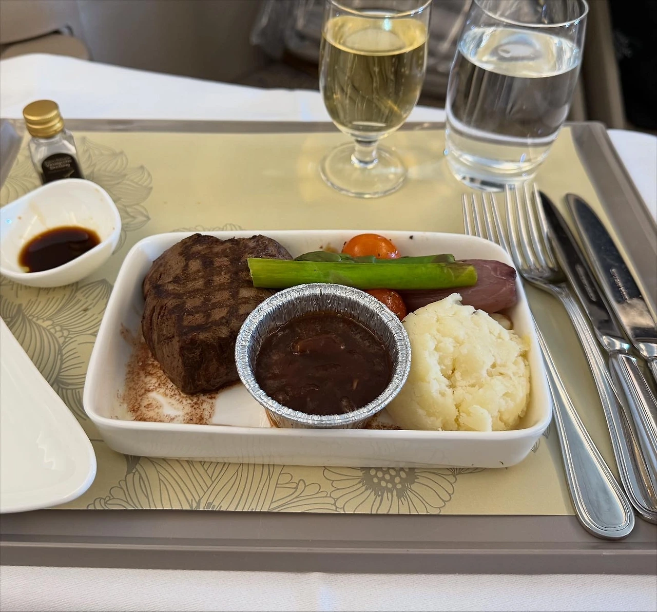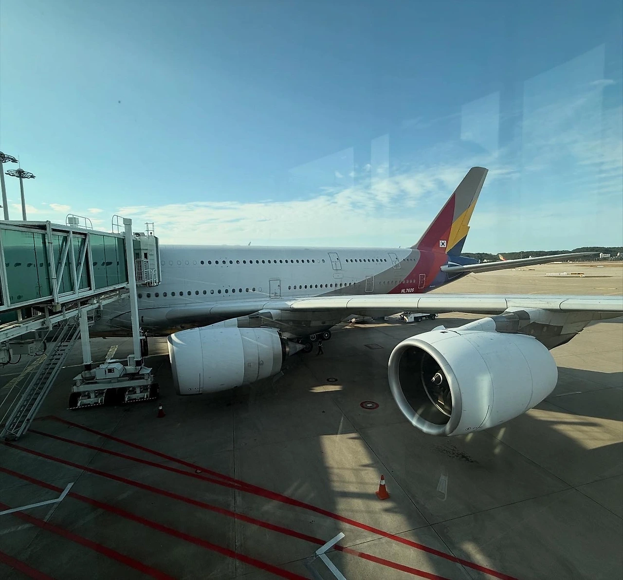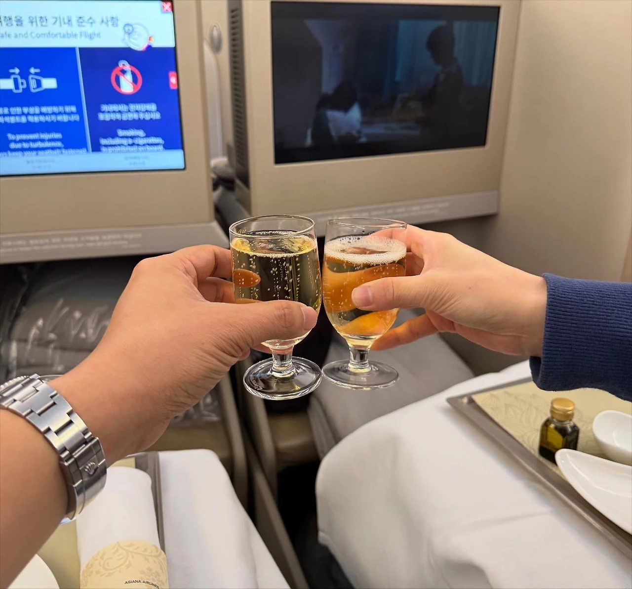 이번 여행에서는 세계 최대 항공기이자 ‘하늘 위의 호텔’로 불리는 A380을 이용했다. 비행기 한 대 치고는 어마어마한 인파가 이동하는 느낌이었다. 아시아나 라운지에서 잠깐 시간을 보낸 뒤 비행기 2층 비즈니스석에 올라 아내와 함께 샴페인을 한 잔 나누었다. 기내 점심은 쇠고기 안심 스테이크, 저녁은 고추장 광어 김치찜으로 제공되었는데, 기대 이상으로 맛있었다. 하지만 예전보다 기내 서비스가 다소 소홀해진 느낌이었다. 대한항공과의 통합 및 합병 준비 때문일까 하는 생각이 스쳤다.