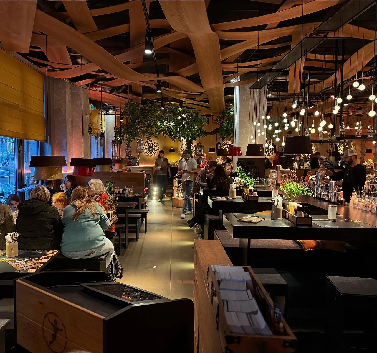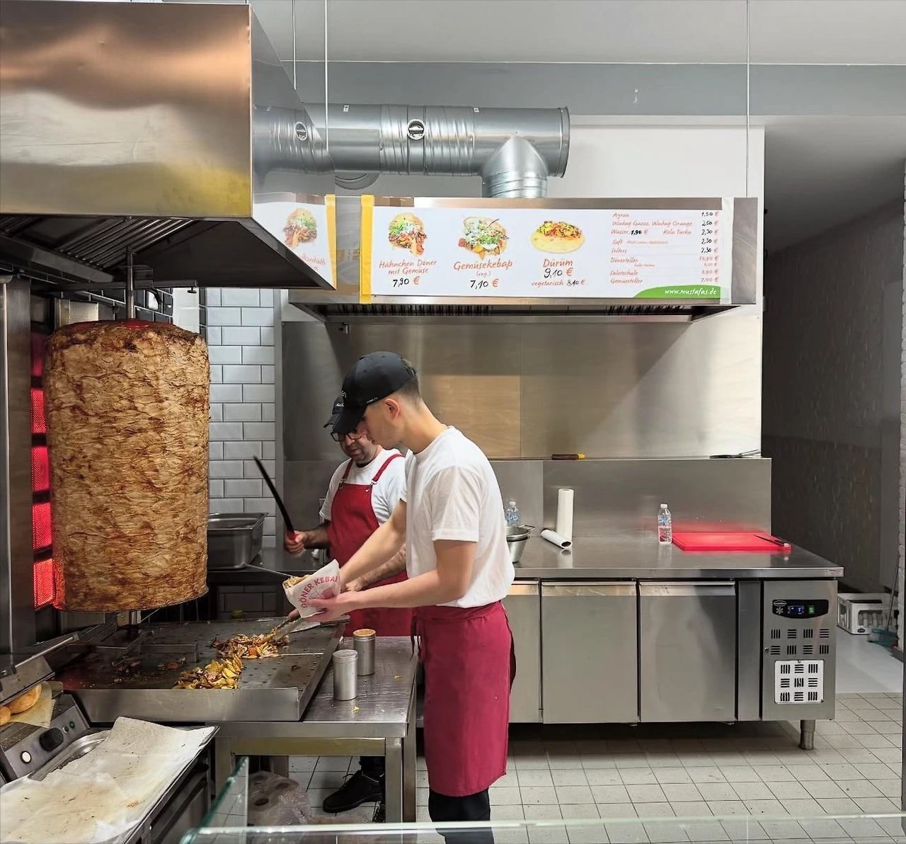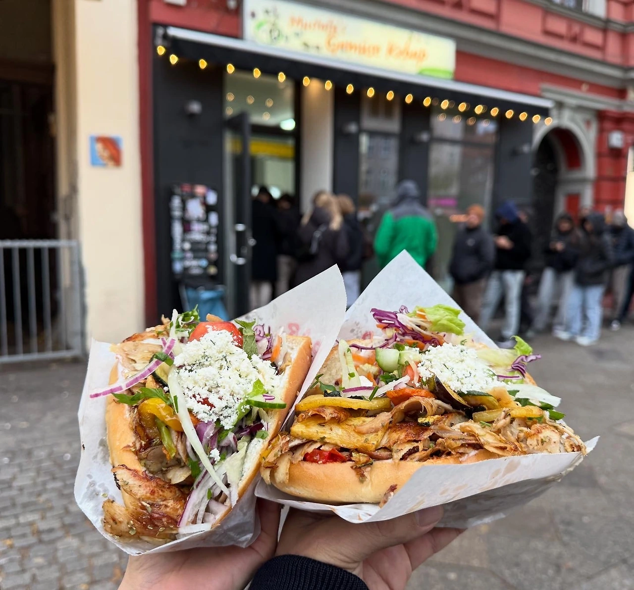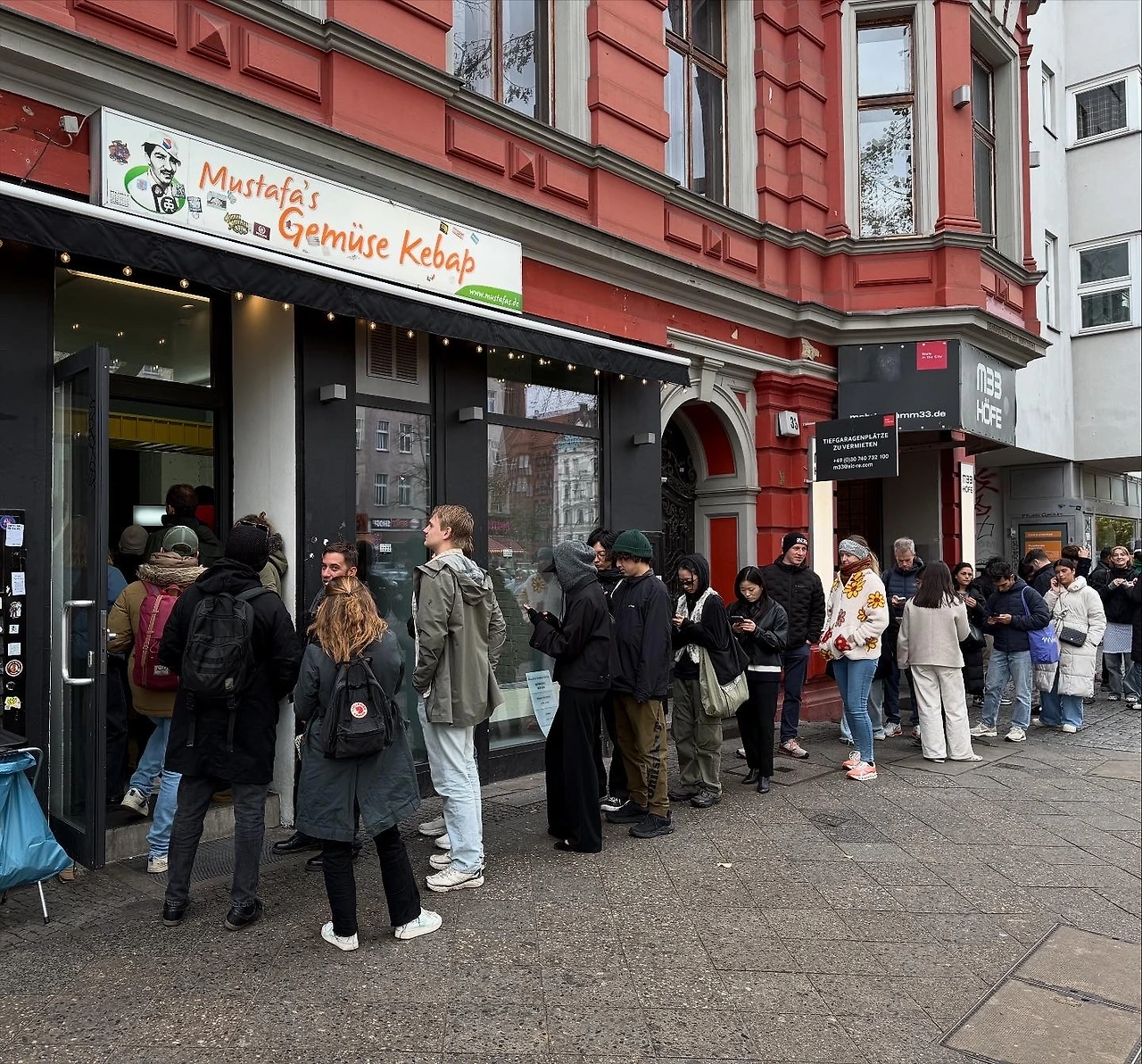 가을의 쌀쌀한 공기 속에서 낙엽이 흩날리는 거리를 따라 걸으며 무스타파 케밥(Mustafa’s Gemüse Kebap)으로 향했다. 베를린 최고의 케밥 가게답게, 가게 앞에는 이미 긴 줄이 늘어서 있었다. 독일은 1960년대 튀르키예 출신 노동자들을 대거 받아들이면서 자연스럽게 케밥 문화가 자리 잡았는데, 그중에서도 무스타파 케밥은 단연 최고 맛집으로 손꼽힌다. 원래 노점상으로 시작했지만 지금은 1층 매장으로 정착해 깔끔하고 쾌적한 분위기를 갖추고 있었다.