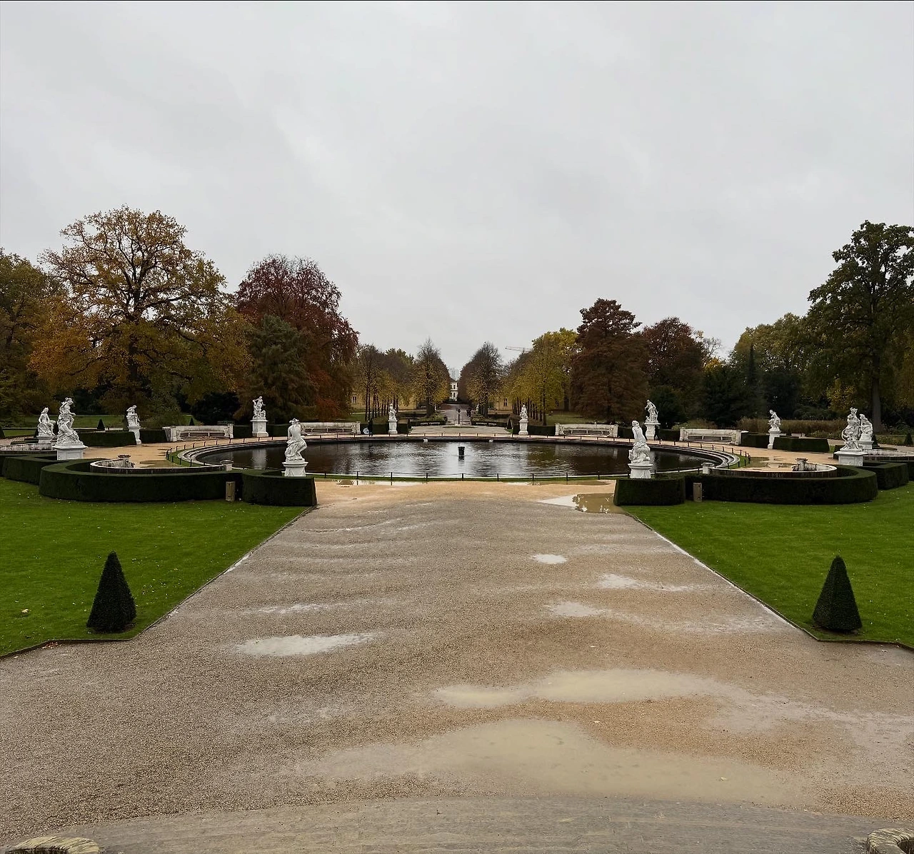 상수시 궁전은 프리드리히 대왕의 별궁으로, 이름은 ‘근심이 없다’는 뜻을 지닌다고 한다. 드라마 《눈물의 여왕》에 등장해 꼭 와보고 싶었던 명소이기도 했다. 이름 그대로 왕이 골치 아픈 일에서 벗어나 여유로운 휴식을 즐기고자 했던 의도가 엿보였다. 건물 자체는 비교적 소박했지만, 궁전 앞뒤로 펼쳐진 넓은 정원이 가을 햇살과 노랗게 물든 나뭇잎과 어우러져 한층 더 운치 더했다. 비가 내리는 날씨 덕분에 정원의 모습이 조금은 차분하고 몽환적인 분위기를 자아내, 또 다른 매력을 느낄 수 있었다.