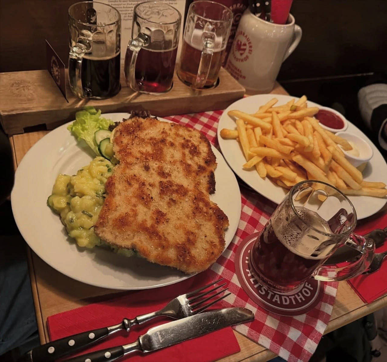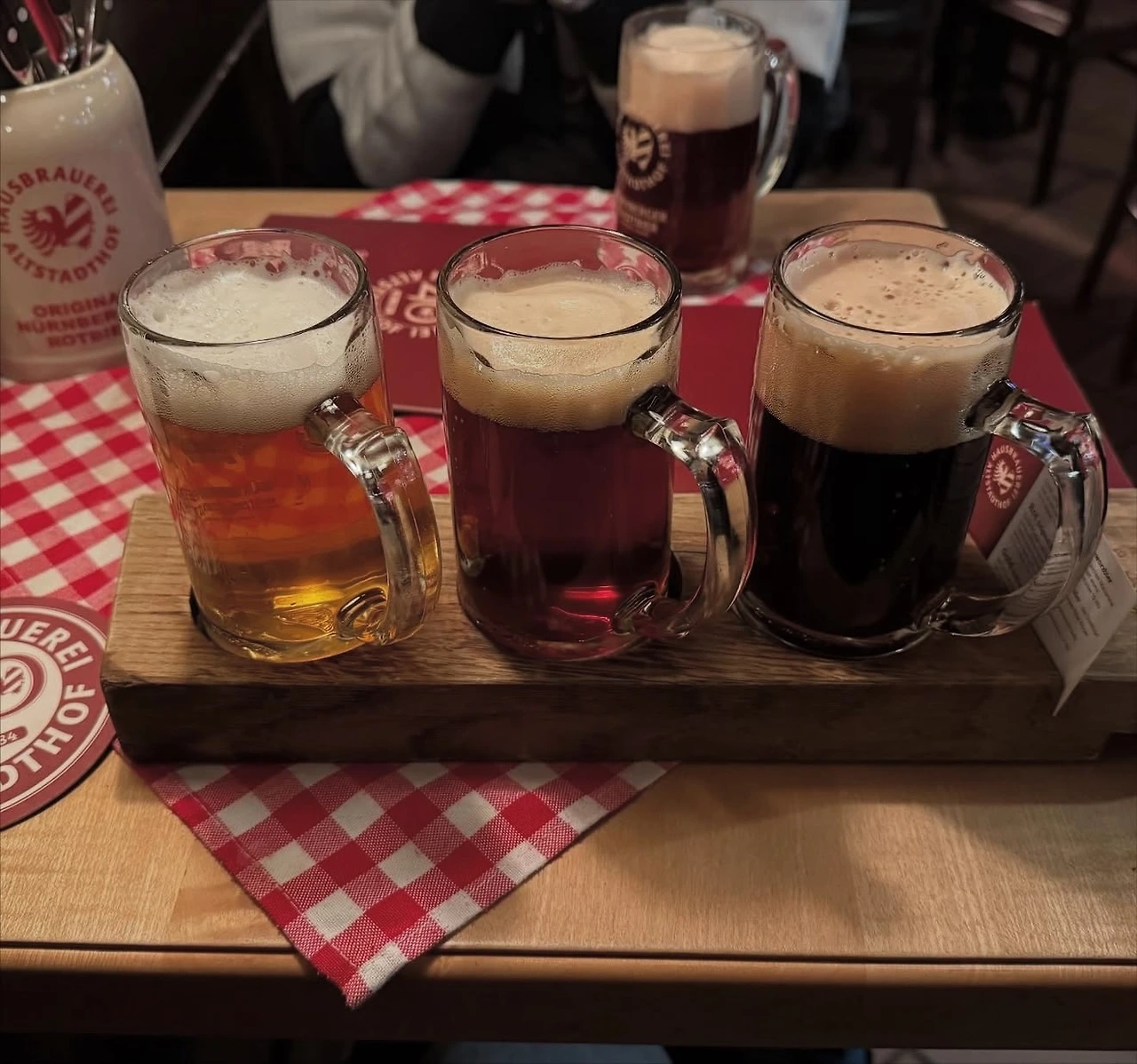 저녁에는 알트슈타트호프(Hausbrauerei Altstadthof)를 찾았다. 맥주 애호가라면 반드시 들러야 한다는 곳이다. 이곳은 한때 중세 뉘른베르크에서 유행했다가 명맥이 끊어진 로트비어(레드비어)를 현대적으로 되살려 판매하는 것으로 유명하다. 맥주 샘플러를 주문하니 흑맥주–로트비어(레드비어)–필스너가 순서대로 놓였는데, 마치 독일 국기의 세 가지 색을 표현한 듯해 인상적이었다. 맥주와 함께 슈니첼과 프렌치프라이로 저녁을 해결했다.