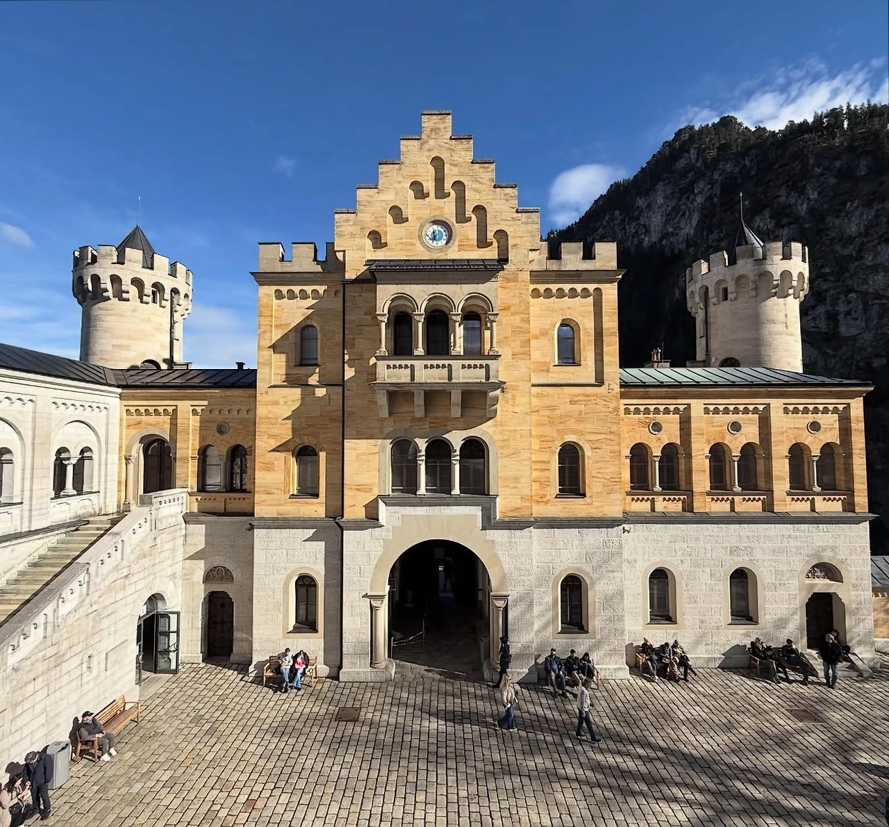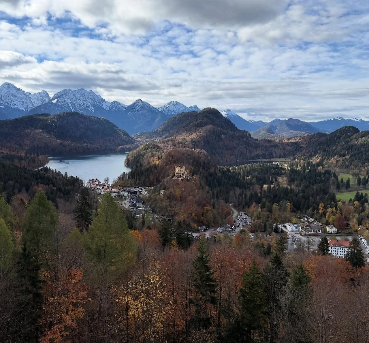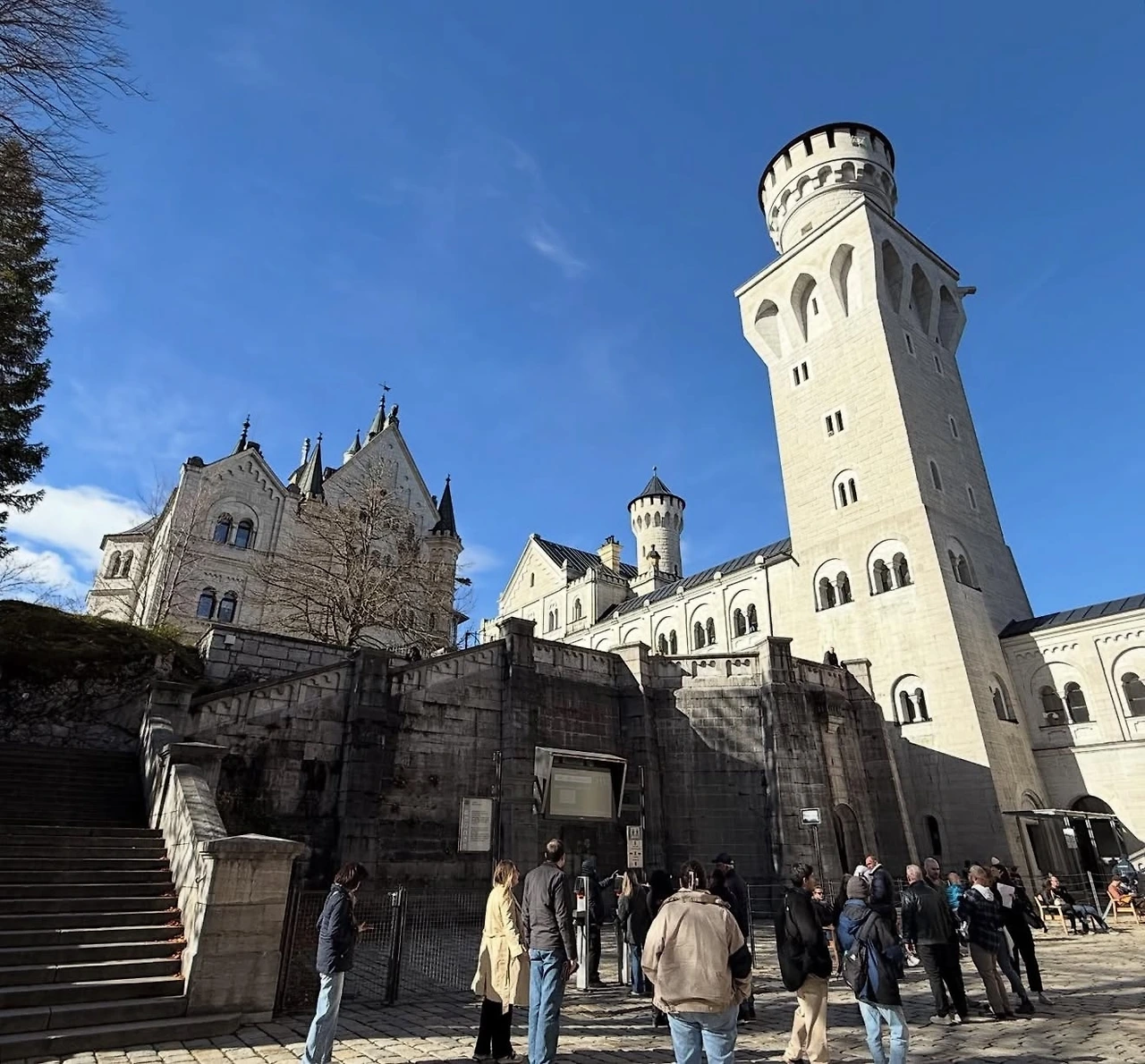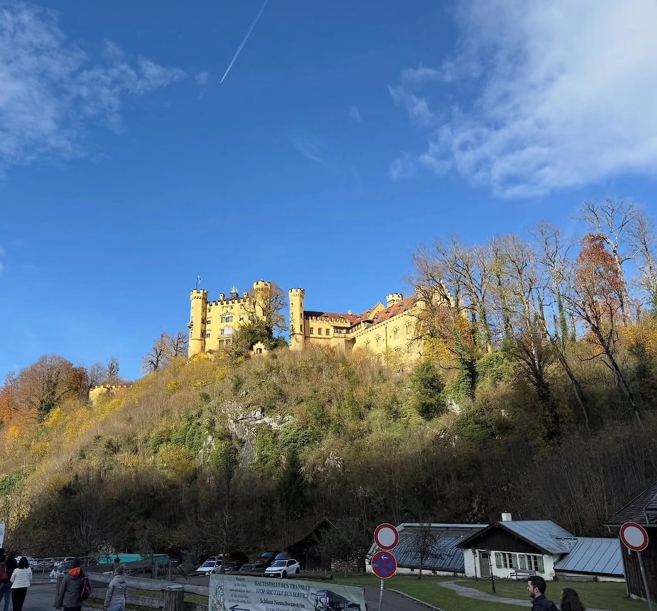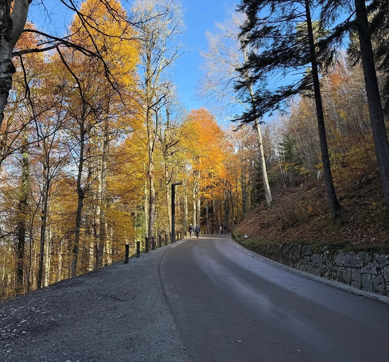 걸어 올라가는 길에 호엔슈반가우성(Schloss Hohenschwangau)이 보였다. 뮌헨 일정 때문에 가까이 보지는 못했지만, 멀리서나마 황금빛 외관을 감상할 수 있었다. 마차길을 따라 산길을 오르며 낙엽이 물든 가을길을 걷는 느낌이 참 좋았다. 성은 멀리서는 가까워 보였으나, 올라갈수록 그 거대한 규모에 감탄이 절로 나왔다.