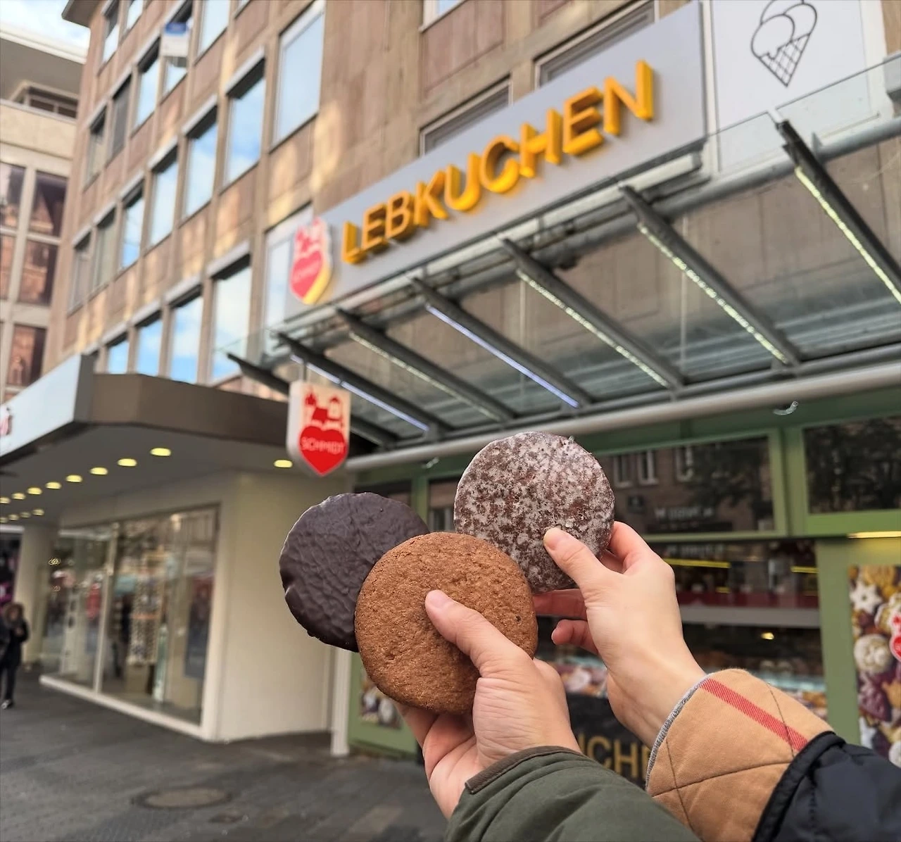 중세 도시의 아름다움을 느끼며 거리를 걷다가 렙쿠헨 슈미트(Lebkuchen-Schmidt) 가게에 들어갔다. 독일식 생강빵(진저브레드)인 렙쿠헨(Lebkuchen)은 특히 크리스마스와 잘 어울려 ‘크리스마스 비스킷’이라 불리는데, 그중에서도 가장 유명한 도시가 뉘른베르크라고 한다. 가게에 앞에서 렙쿠헨 인증샷도 한 장 남겼다.