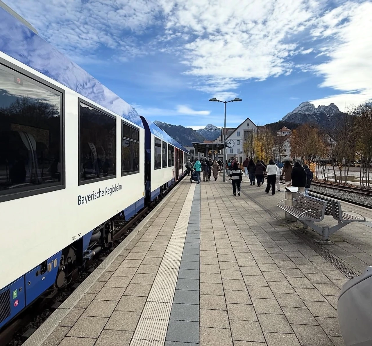 5일 차에는 뉘른베르크에서 퓌센과 뮌헨을 모두 둘러보는 바쁜 일정이 이어졌다. 먼저 퓌센으로 향했다. 뉘른베르크 중앙역에서 ICE 고속열차를 타고 약 1시간 30분 만에 뮌헨에 도착했고, 이후 완행열차로 환승해 Buchloe역에서 다시 환승하여 약 2시간 만에 퓌센에 도착했다. 퓌센으로 다가갈수록 독일의 평온한 시골 풍경이 펼쳐졌고, 도착 무렵에는 목가적인 분위기의 마을이 보였다. 푸른 초원 위에 말과 소가 여유롭게 방목되고 있었다. 퓌센역(Füssen)에 도착한 뒤 버스를 타고 노이슈반슈타인성(Schloss Neuschwanstein)으로 이동했다.