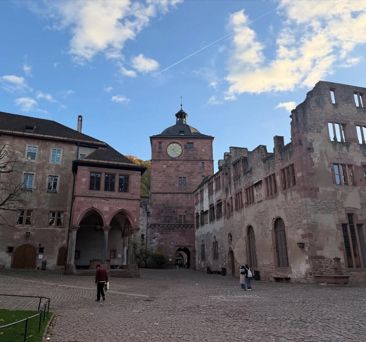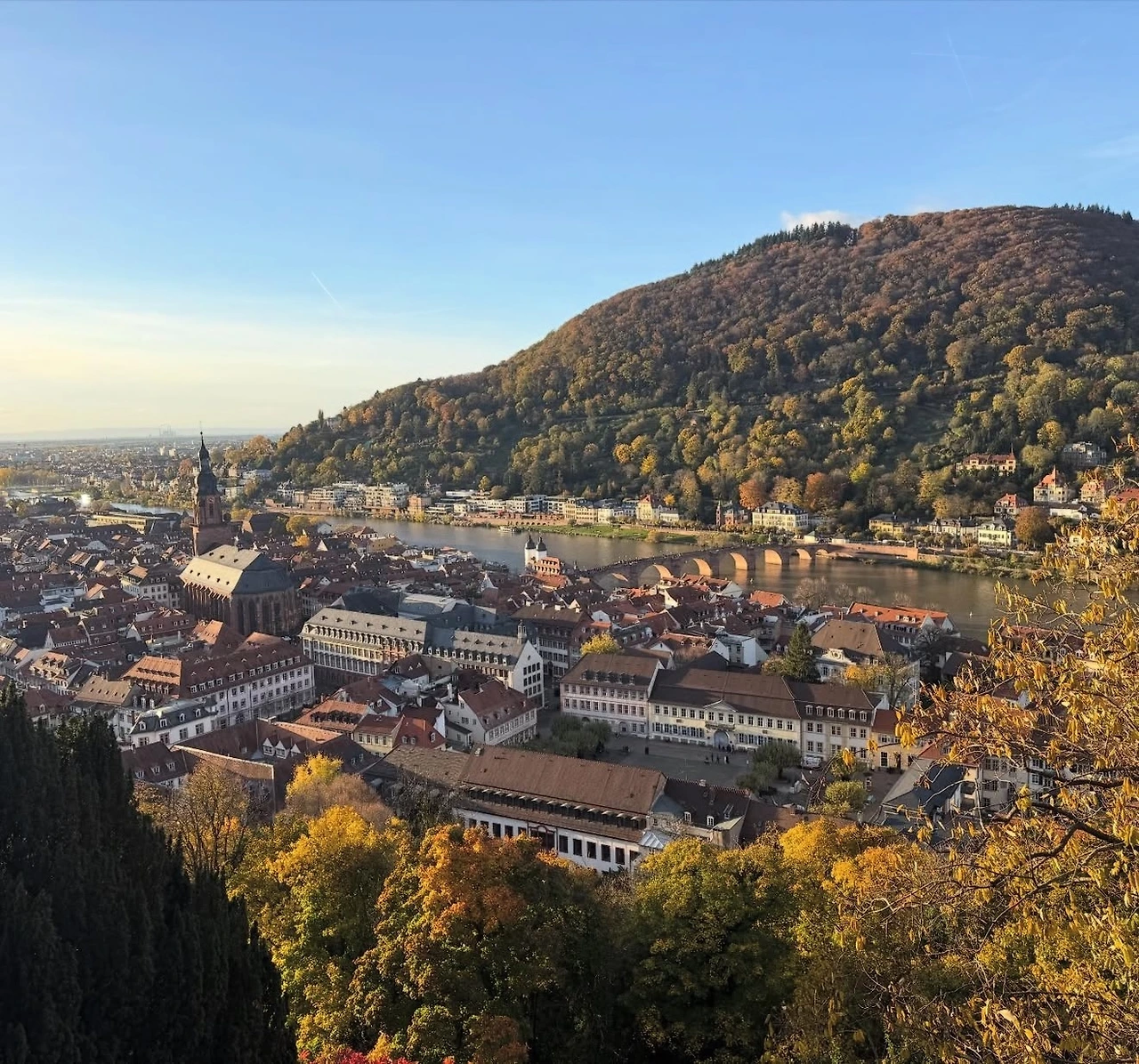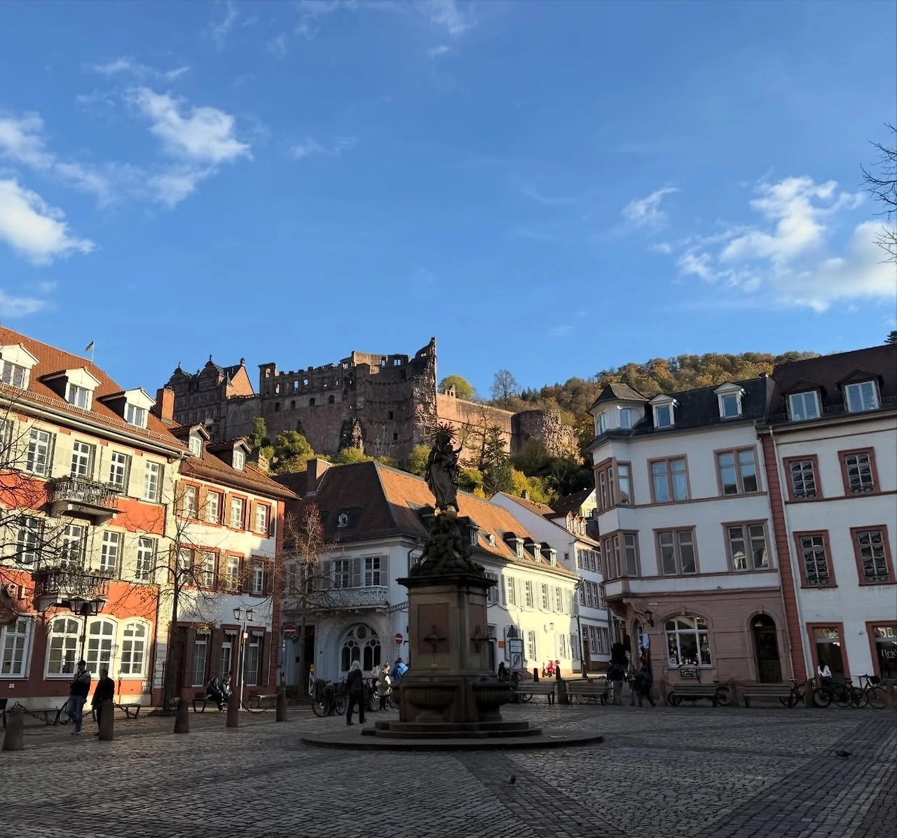중세풍의 고풍스러운 거리를 따라 걷다 보니 성령교회와 마르크트 광장(Marktplatz)이 나타났다. 다른 도시에서도 교회와 광장을 많이 봤지만, 이곳은 광장 너머로 언덕 위에 자리한 하이델베르크성(Schloss Heidelberg)이 배경처럼 서 있어 더욱 특별하고 그림 같았다. 하이델베르크성을 포함한 도시 전체가 은은한 붉은빛을 띠고 있어 더욱 인상적이었는데, 이 지역의 토양 때문이 아닐까 하는 생각도 들었다.