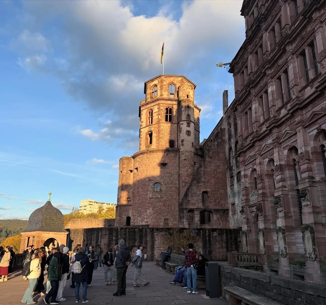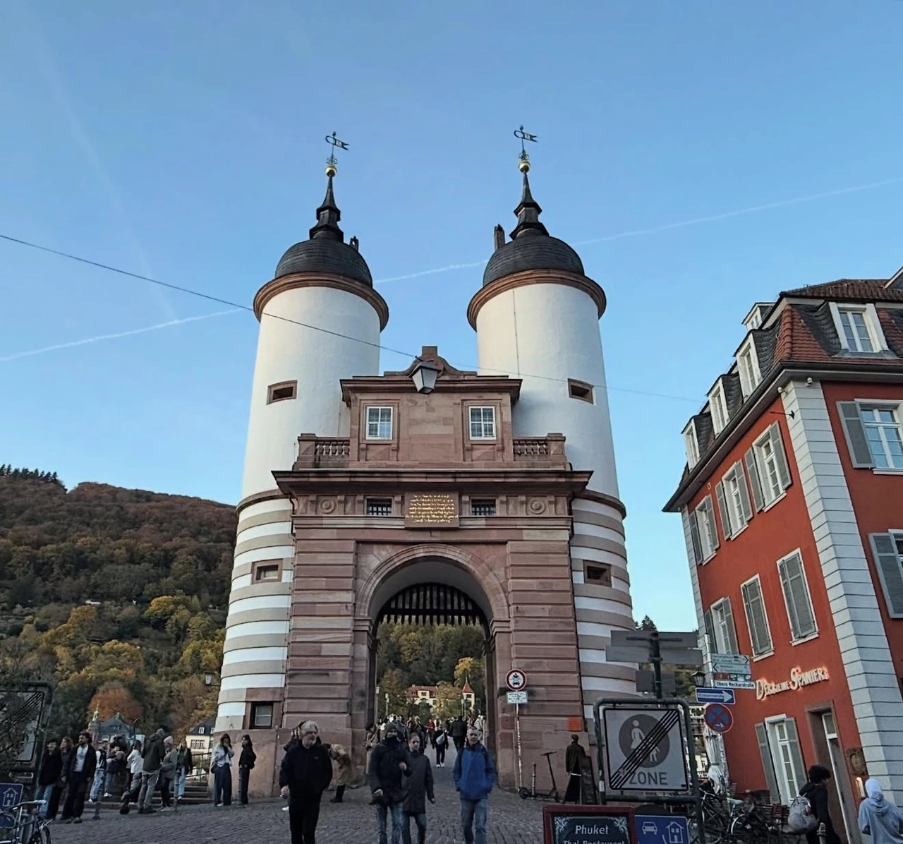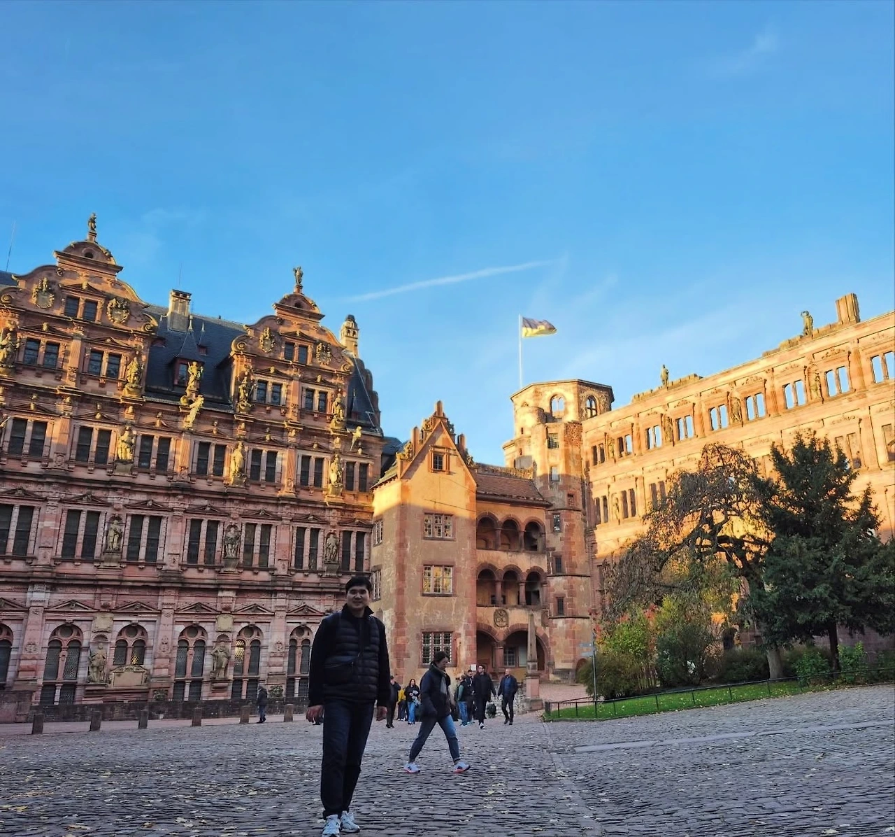 중세풍의 고풍스러운 거리를 따라 걷다 보니 성령교회와 마르크트 광장(Marktplatz)이 나타났다. 다른 도시에서도 교회와 광장을 많이 봤지만, 이곳은 광장 너머로 언덕 위에 자리한 하이델베르크성(Schloss Heidelberg)이 배경처럼 서 있어 더욱 특별하고 그림 같았다. 하이델베르크성을 포함한 도시 전체가 은은한 붉은빛을 띠고 있어 더욱 인상적이었는데, 이 지역의 토양 때문이 아닐까 하는 생각도 들었다.