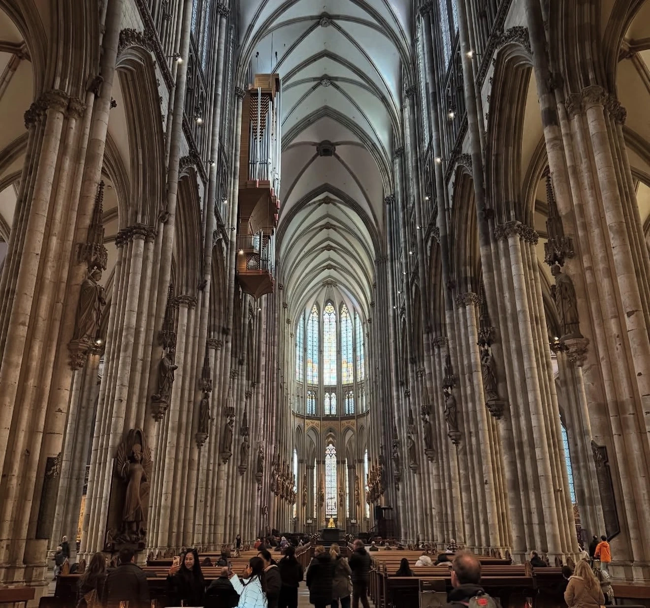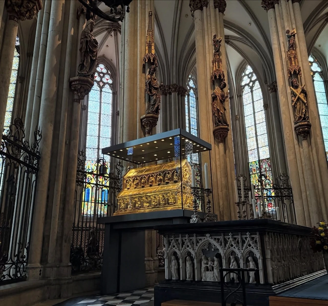 쾰른 중앙역에 내리자마자 눈앞에 쾰른 대성당(Kölner Dom)이 압도적인 규모로 우뚝 서 있었다. 독일에서 여러 성당을 봤지만, 이곳은 단연 가장 거대하고 화려했다. 1248년부터 1880년까지 약 600년에 걸쳐 지어진 고딕 양식의 성당으로, 약 157m 높이의 첨탑과 정교한 장식이 웅장함을 더했다. 내부에는 형형색색의 스테인드글라스와 역사적인 예술품들이 가득했고, 중앙 제단 깊숙한 곳에는 동방박사 세 사람의 유골함이 보관되어 있었다.