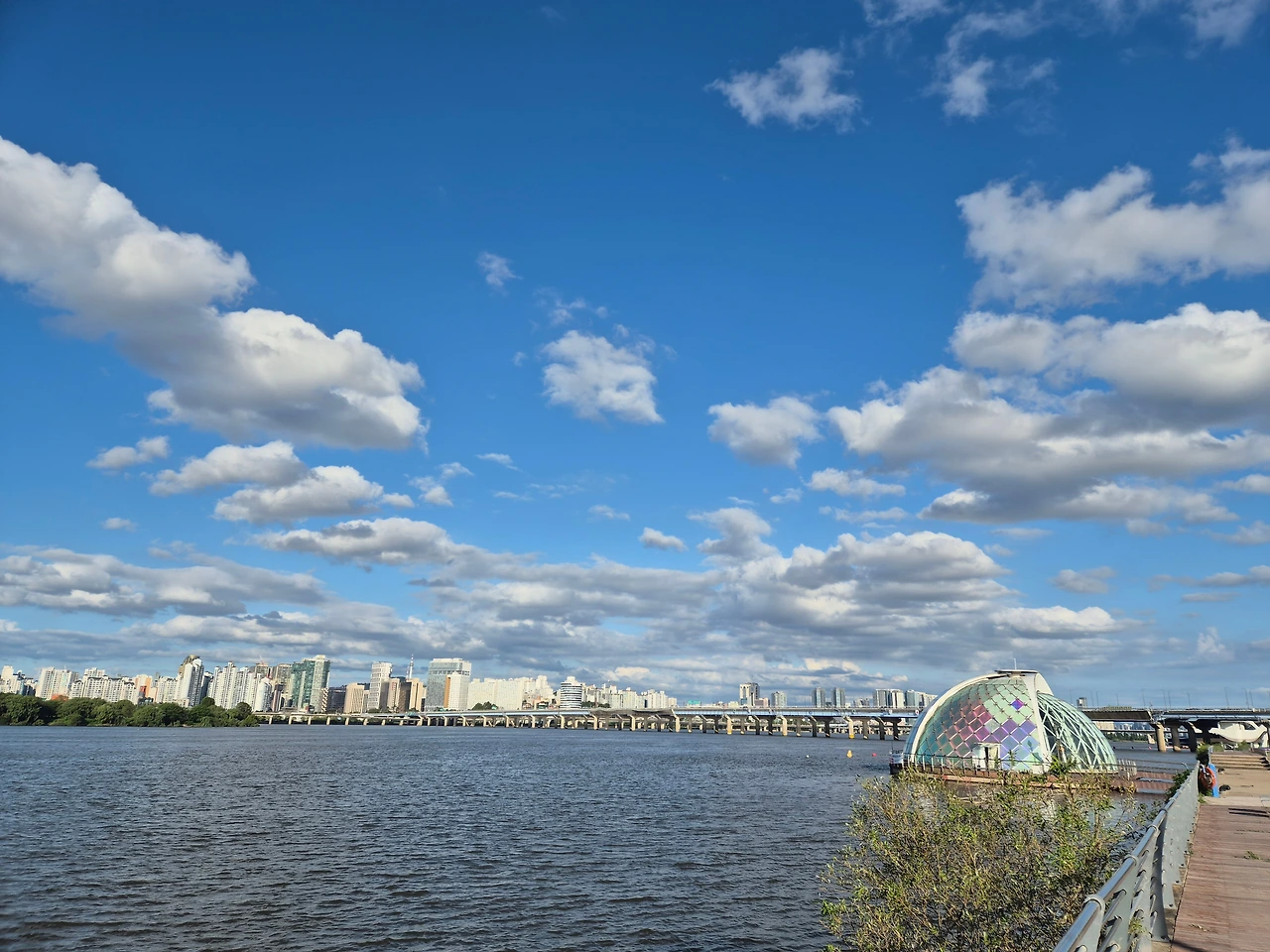 7. 여의도 한강공원으로 간다. 이동하는 순간 차는 막히지 않는다. 주차하고 차에서 텐트를 꺼낸다. 접이식 텐트.. 8만 원 주고 샀다는데, 오늘 두 번째 이용이다. 이제 4만 원이다. 한 10번은 써야 할 텐데... 비가 왔는데 한강물이 불어있다. 맑은 날과 하늘의 구름, 그리고, 한강의 풍경이 어울려 너무 좋다. 둘이 방방 뛰며 좋아라 한다. 텐트에 들어가 등을 붙이니 피로가 풀린다. 새벽부터 오후 4시까지 연속된 일정은 살짝 피로감이 느껴진다. 편안하게 시간을 보낸 후, 저녁시간에 안양으로 이동을 한다. 차 겁나 막힌다.