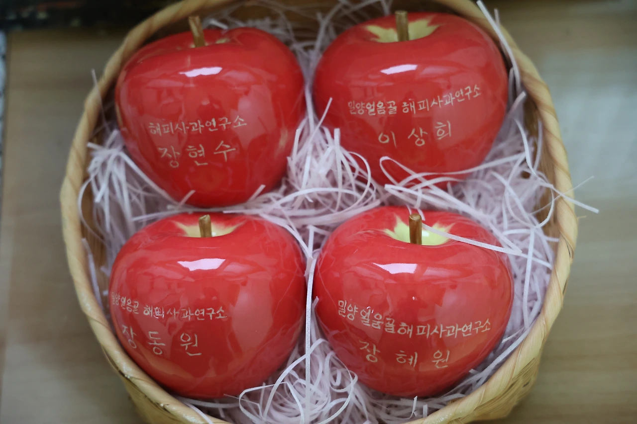 또한 귀한 회원들에게 소속감과 유대관계를 높이고자 기념품을 만들어 함께 나누고 싶었다. 기념품은 아는 도예작가님께 부탁을 드려서 빨간 사과 도예를 만들기로 했다. 그리고 '밀양얼음골해피사과연구소 ㅇㅇㅇ'라는 각각의 이름을 새겨 넣기로 했다.