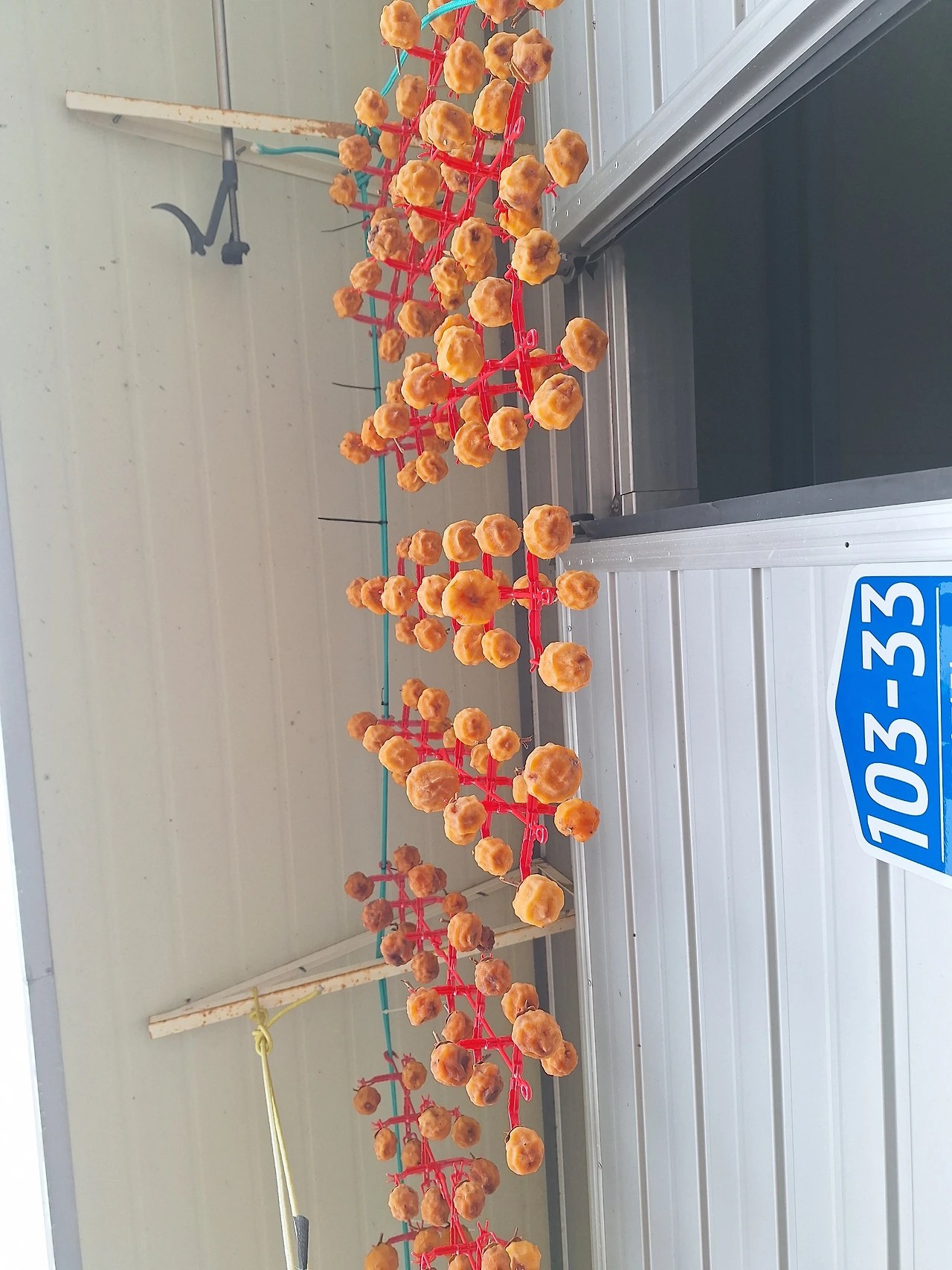 창고 지붕아래 가로로 길게 근굿줄(아기가 났을 때 시골에서 대문 위에 길게 쳐놓는 새끼줄. 줄에 고추 마늘 숯 등을 꽂아 놓음) 마냥 예쁜 곳감 휘장이 쳐졌다. 줄을 엮어 가지런히 매달아 놓으니 보기에 좋다. 휘렘술탄의 아름다운 이마를 둘렀던 한가닥 보석을 연상케 했다.