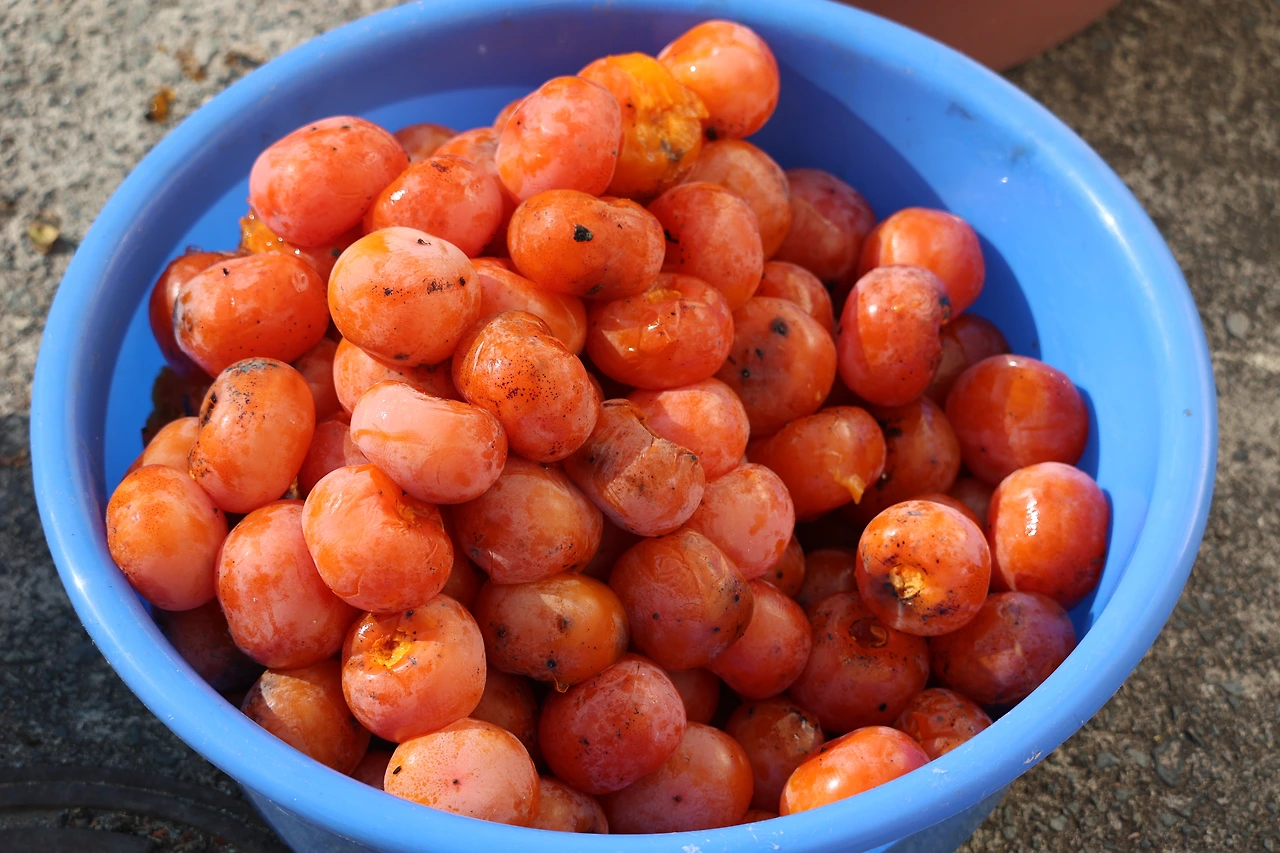 하나 하나 꺼내서 꼭지를 모두 따냈다. 그리고 넓은 대야에 담았다. 한 상자에 한 대야씩. 더 이상은 들고 일어서기가 힘들었다. 자칫 엎지를 지도 몰랐다. 조심이 최고였다. 가득담은 홍시 대야를 두 손으로 꽉잡고 창고로 향했다. 단지 두껑을 열고 단지 속으로 하나씩 일일이 포개 담았다. 두번째 세번째 대야까지.
