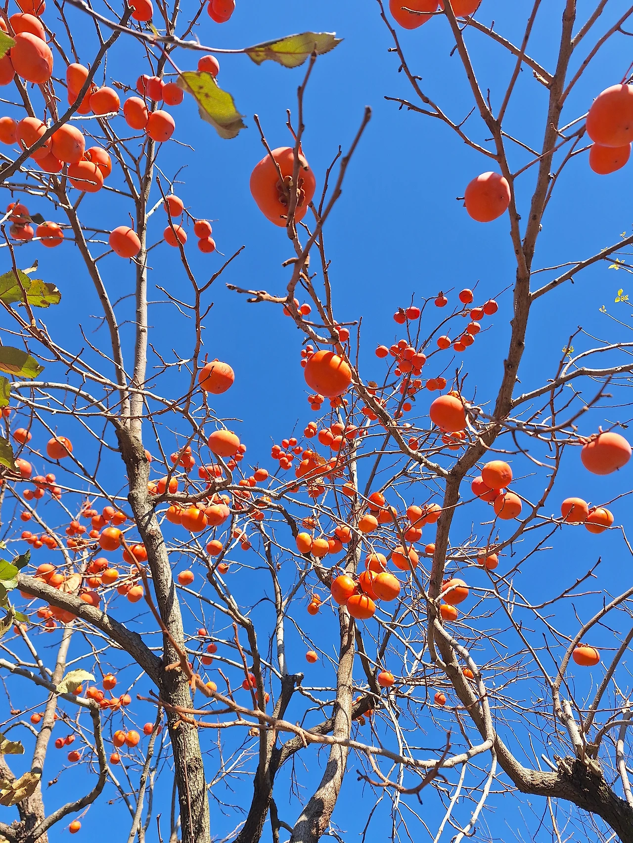 우리 감나무는 위 아래 내리막 긴 밭 맨 아래쪽 언저리에 우뚝 서 있다. 한그루다. 펼친 가지가 사방으로 30미터는 족히 넘을 것이다.