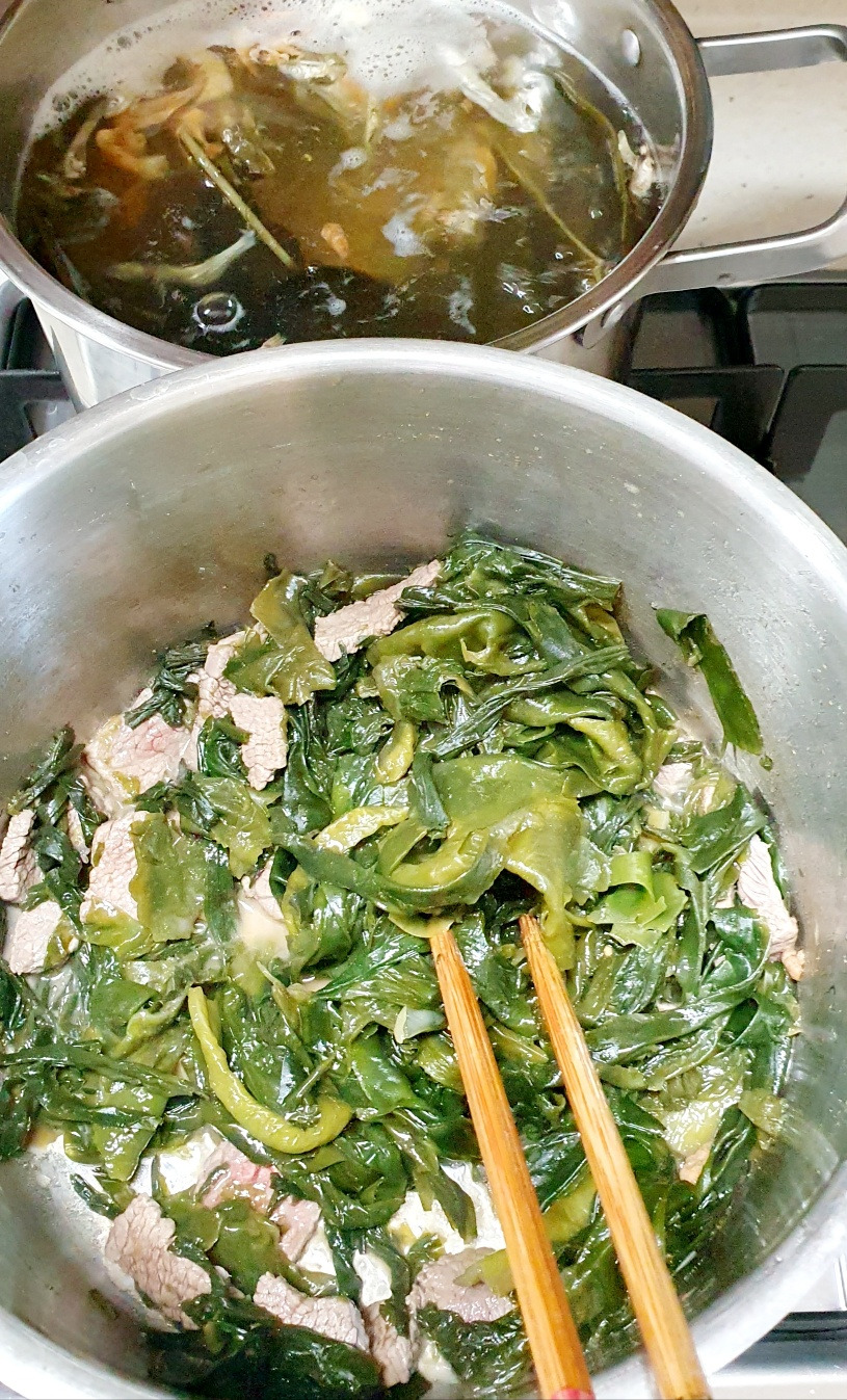 불린 미역을 잘 씻어 물기를 꼭 짰다. 큰 냄비를 불에 올려 충분히 달군 후 참기름을 두르고 쇠고기와 함께 미역을 볶았다. 설탕 약간과 간장으로 밑간 하는 것도 잊지 않았다. 고소한 냄새가 진동한다. 냉장고에 남은 육수를 붓자 ‘자자작!’ 하는 맛있는 소리가 경쾌하게 들린다. 물이 모자라는 것 같아 다시마를 넣고 생수를 조금 더 넣었다. 미역이 부풀어 오르며 거품이 냄비 가장자리에서 보글보글 일어난다. 재차 간장으로 간을 맞추었다. 진한 국물이 깊은 맛을 낸다. 비주얼은 물론 맛 역시 흡족하였다. 한소끔 더 끓이고 불을 껐다.