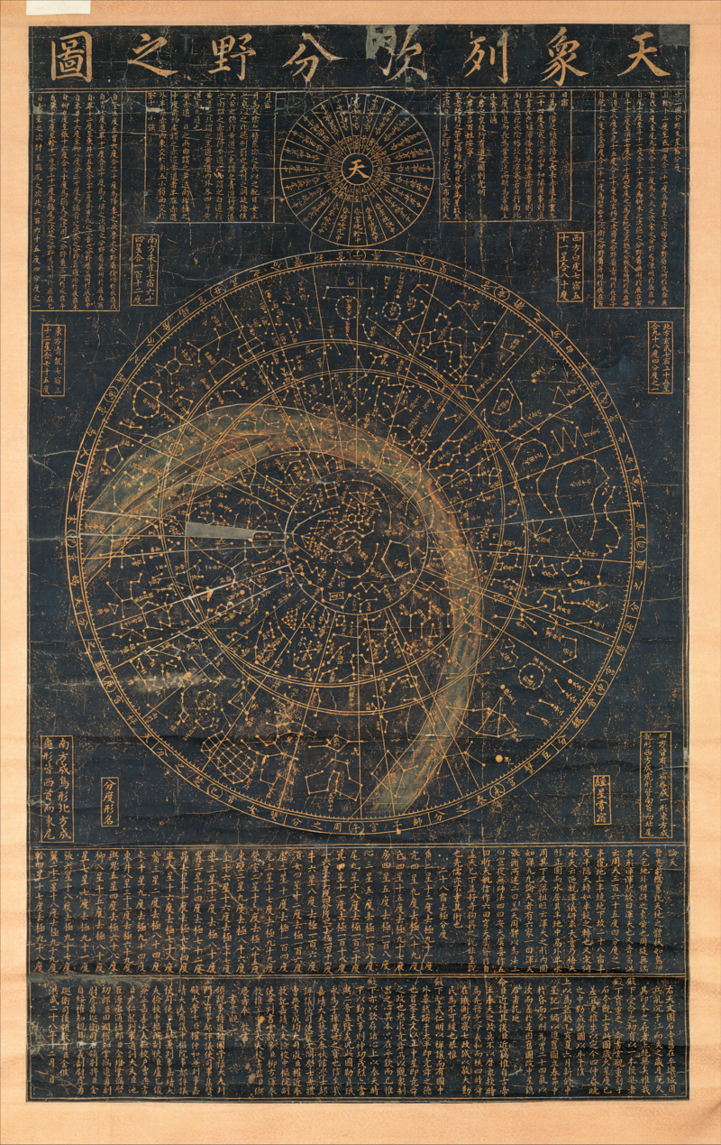 또 북두칠성처럼 계절과 상관없이 항상 볼 수 있는 별자리 주극성 또한 그려져 있습니다. 가운데에는 하늘의 북극과 남극을 잇는 둥근 적도가 표시되어 있고, 태양이 하늘의 별자리 위를 이동하는 길인 황도가 그려져 있습니다. 이렇게 태양이 이동하는 데 따라 음양의 교체와 추위더위가 생겨난다는 것을 설명하면서, 태양을 왕에 비유해 백성과의 긴밀한 관계를 설명하는 부분도 있습니다. 가장 놀라운 것은 당시 눈으로 볼 수 있는 북반구의 거의 모든 별자리와 은하수까지를 표시해 놓았다는 사실입니다.