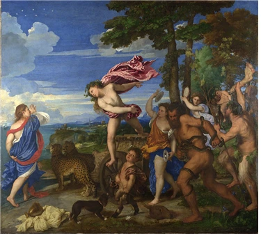 티치아노(1490–1576) 作 / 바다 멀리 테세우스는 막 아리아드네를 낙소스에 버려두고 떠났고, 디오니소스가 치타 두 마리가 끄는 전차에서 뛰어내리면서 아리아드네와 사랑에 빠졌다. 하늘에는 디오니소스가 그녀에게 준 별자리 왕관자리가 그녀 머리 위 하늘에 반짝이고 있다.