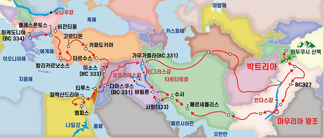 알렉산드로스 3세 정벌로드( )안은 전투(기원전) 및 사건 년도 / 일러스트 박진서(그림을 클릭하면 크게 볼 수 있습니다)