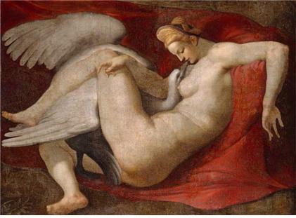 이 또한 바람둥이 제우스와 관련된 이야기랍니다. 스파르타의 왕비 레다의 미모에 빠져 제우스가 아내 헤라 몰래 레다를 만나기 위해 백조로 변했습니다. 그러고는 마치 독수리에게 쫓기는 것처럼 해서 날아가 레다의 품속에 안겨, 결국에는 레다의 사랑을 얻는 데 성공합니다. 레다는 그 후 남편과 동침해서 낳은 알 두 개와 제우스와의 사이에서 생긴 알 두 개, 해서 모두 네 개를 낳았습니다.