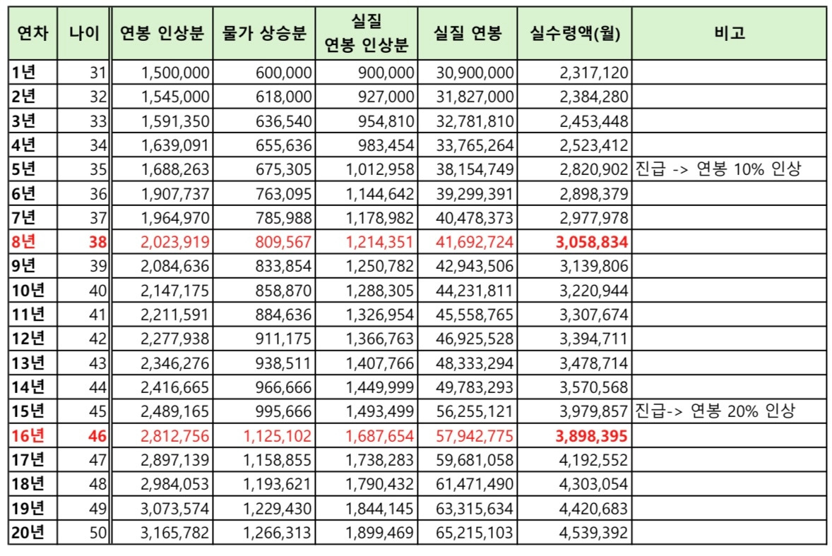 이런 계산하기 싫지만 이제는 아셔야 하니 계산해 보겠습니다. 빠르게 30살에 취직을 했다고 봅시다. 보통 연봉 3,000만 원으로 시작해 연 3~5% 연봉인상을 해줍니다. 이것도 대기업 기준이지, 보통은 인상도 없는 게 현실이죠. 거기에 매년 상승하는 물가는 연 2~3%. 이를 대입해서 계산해 보겠습니다.