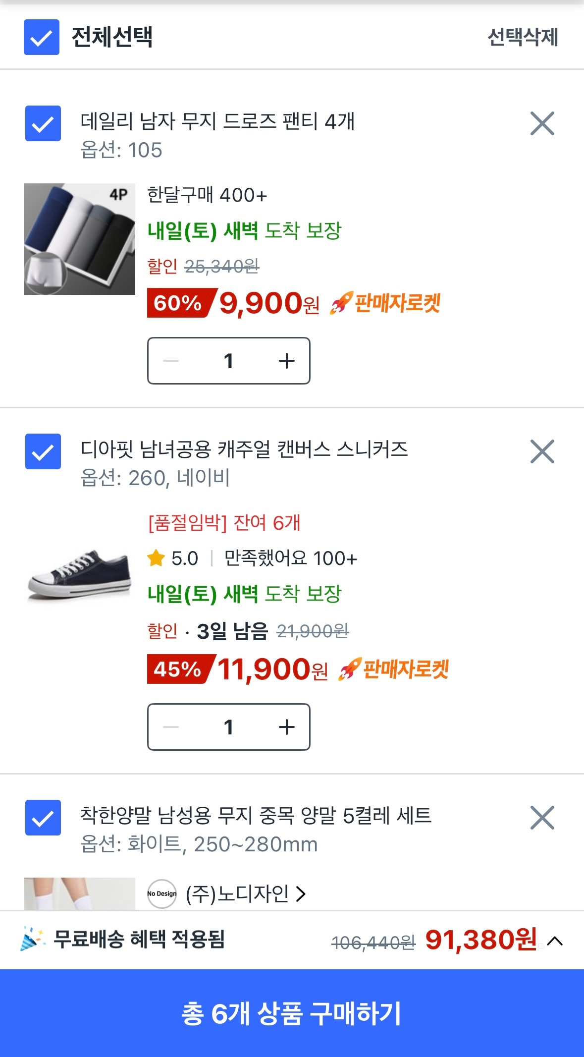 우선 ’의‘부터 보겠습니다. 격식 있는 자리에 참석할 때 입을 용도로 깔끔한 상하의 세트 하나 정도는 있어야겠죠. 얼마 전에 세일하는 제품을 보니까 10만 원 초반이더라고요. 그리고 평상시 입을 옷을 쿠팡에서 최저가로 계산해 보겠습니다. 상의, 하의, 양말, 신발, 속옷까지 약 10만 원 나오네요.