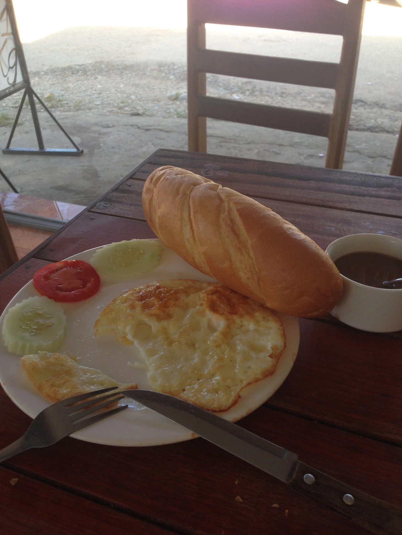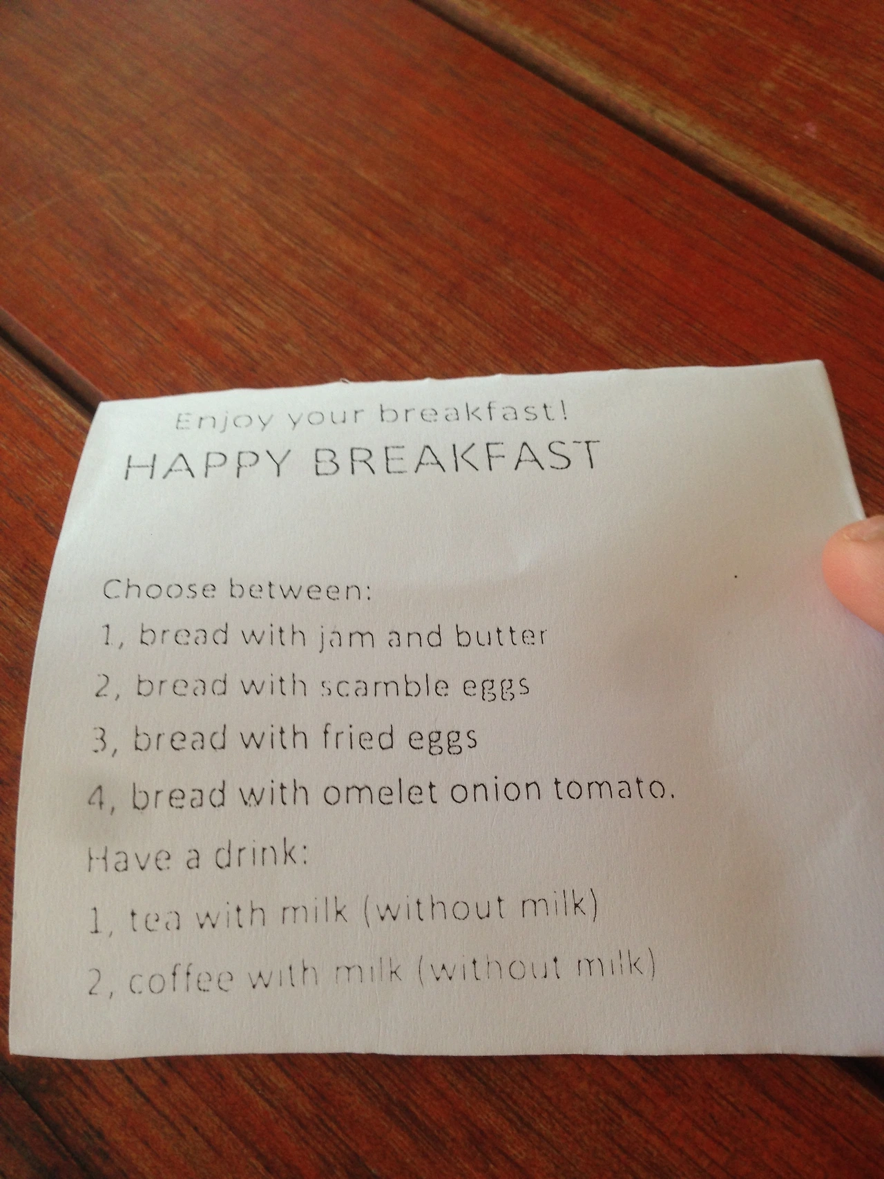 오늘은 오전엔 쉬고, 오후에 탐푸캄(블루 라군)을 갈 예정이에요. 물론 어제 카야킹을 했던 동생들과 함께요. 최초에 여행 계획을 세울 때 7박 8일이라, 위앙짠에 머물 땐 경비를 최소한으로 사용하고 방비엥에서 좀 더 편하게 지내자는 생각을 했었거든요. 무료로 제공하는 나름의 조식에 대한 부푼 꿈을 안고 리셉션으로 내려가니 아침식사 메뉴를 주네요.