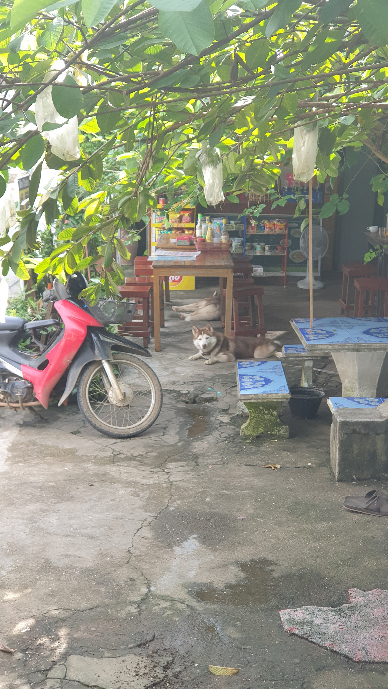 앞으로 열흘간 머무르게 될 숙소 앞에 식당 겸 생과일주스 파는 곳이 있어요. 게다가 허숙희도 제가 궁금한 건지 저를 유심히 쳐다보네요. 귀여운 녀석이에요.
