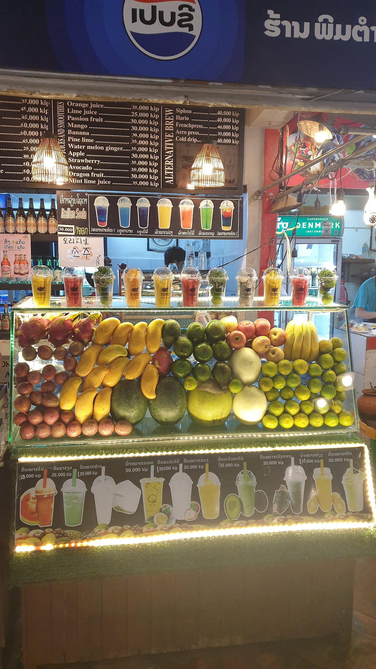 오늘은 밥을 먹어야 한다는 생각을 했어요. 5만 킵인데 양은 살짝 모자라지만 뭐 그럭저럭 괜찮았어요. 다만 야시장의 위생상태와 가격을 고려했을 때 다른 곳을 얼른 찾아야겠다는 생각을 했네요. 하루이틀 머물렀다 가는 여행자가 아니니까요. 생과일주스가 먹고 싶어서 망고를 주문했어요. 비엔티안에서 못 마셨던 걸 루앙프라방에서 마시게 되네요.