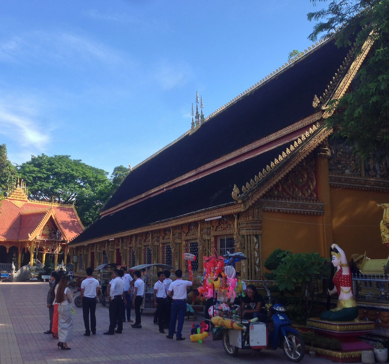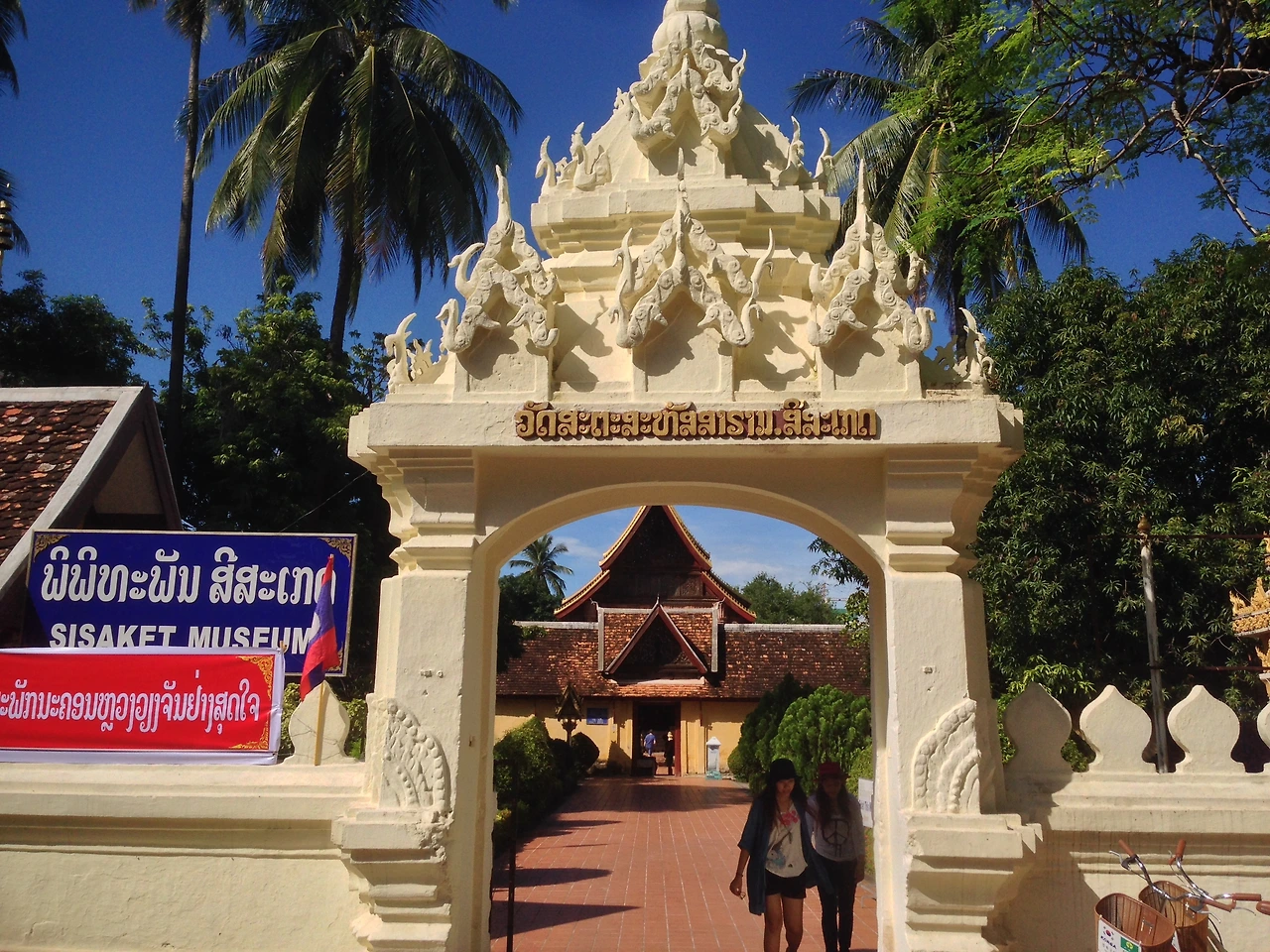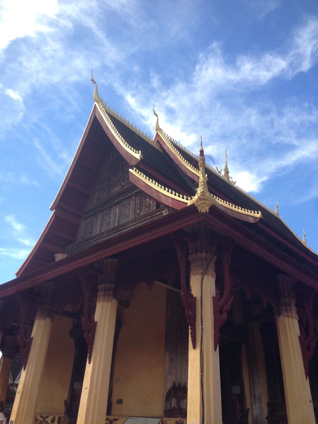 씨싸켓은 6천8백여 개의 불상들이 보관된 회랑과, SIM(대법전)으로 구성되어 있어요. 이제 보니 구름과 한데 어우러져, 지붕 가장자리에 있는 황금색 용이, 파란 하늘을 포효하는 듯한 모습이에요.