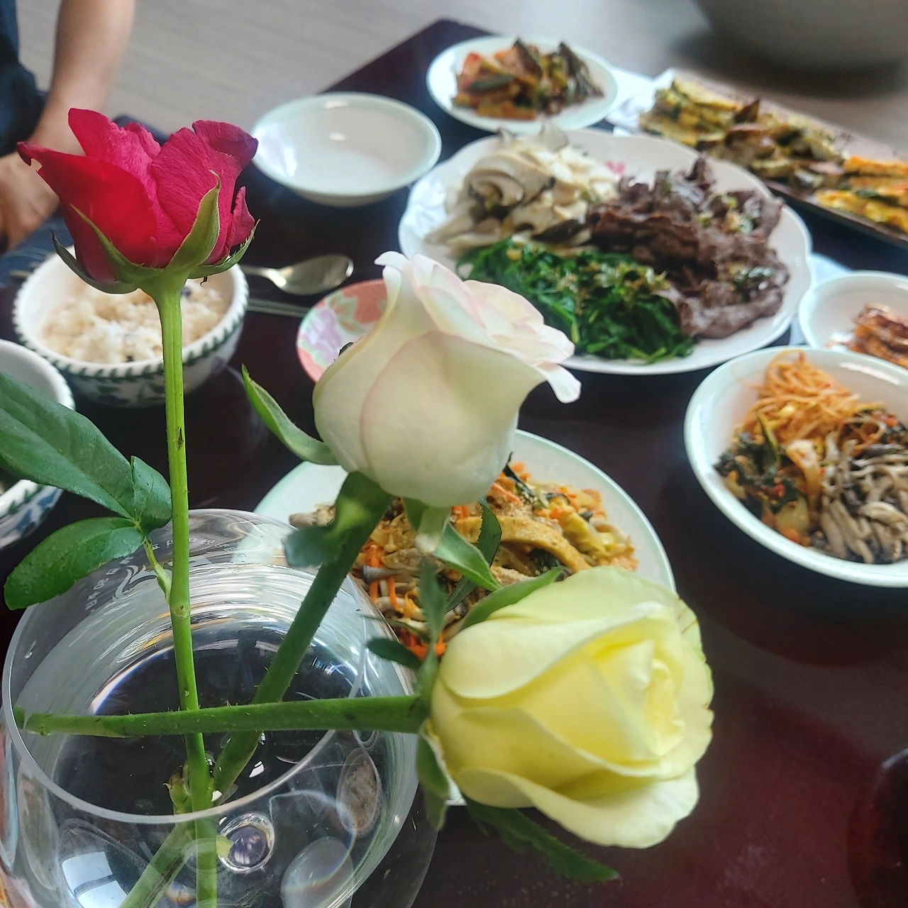 누군가 빨갛고 하얀 장미 3송이를 와인 잔에 비스듬히 꽂아