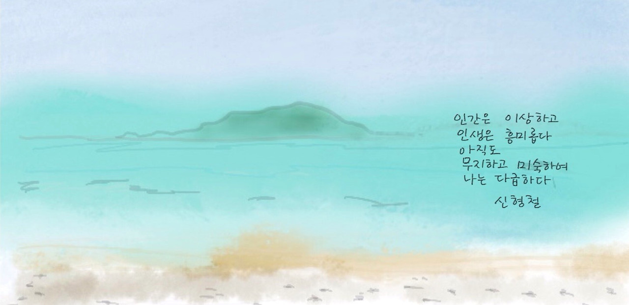 저 첫그림은 나를 비양도로 데려갔던 친구 블로그의 사진에서 정말 거칠게 라인을 따서 그때 보았던 협재해수욕장에서 바라본 비양도의 느낌만으로 마구 문지른 건데 제법 비양비양해서 버리지 않고 첫작품으로 건져두었다. 처음 화장을 하는 여자의 붓질처럼 어설퍼도 그게 그리울 날을 위해서 보존키로 한다. 새로운 재미의 문을 여는 교두보로 삼아 기념하자! 무엇이든 진득하게 해내지 못하고 그만 두기 바쁜 내가 이런 신문물을 사용해 그림에 대해 평생 열등히 억눌린 바윗돌을 치우고 팔을 걷어부친 게 어디냐, 야메로 야매(野昧 촌스럽고 어리석음)스런 그림을 그려보자, 그림축에 끼는 건지도 모르지만 일단 나를 끌어내고 나만 만족시키면 된다. 게을러서 어디 가 배우는 거 숙제하는 거 못하는 내게는 완전 딱이다.